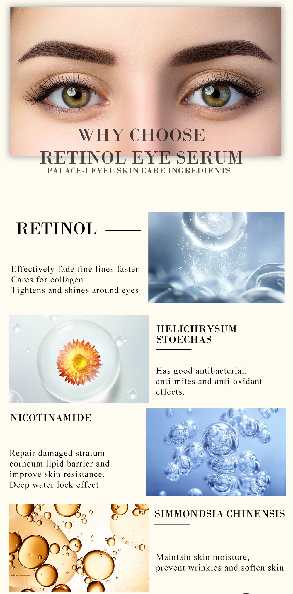 ▶Ингредиенты для ухода за кожей дворцового уровня1. Ретинол-эффективно выцветает тонкие линии быстрее, заботится о коллагене. Подтягивает и блестит вокруг глаз.2. Helichrysum Stoechas-имеет хорошие антибактериальные, анти-клещи и антиоксидантные эффекты.3. Nicotinamide-восстанавливает поврежденный роговой барьер и улучшает сопротивление кожи. Эффект блокировки глубокой воды4. Simmondsia Chinensis-сохраняет влагу кожи, предотвращает появление морщин и смягчает кожу.