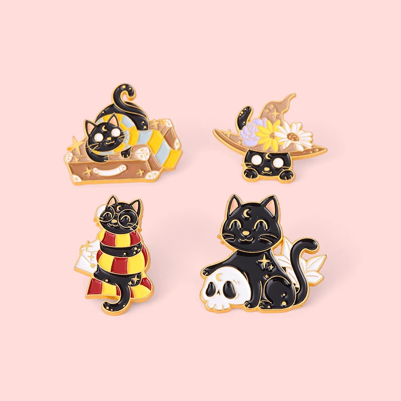 Модный мультяшный черный волшебный кот значок модная шляпа шарф череп металлическая эмалированная брошь индивидуальный милый лацкан рюкзак ювелирные изделия подарок
