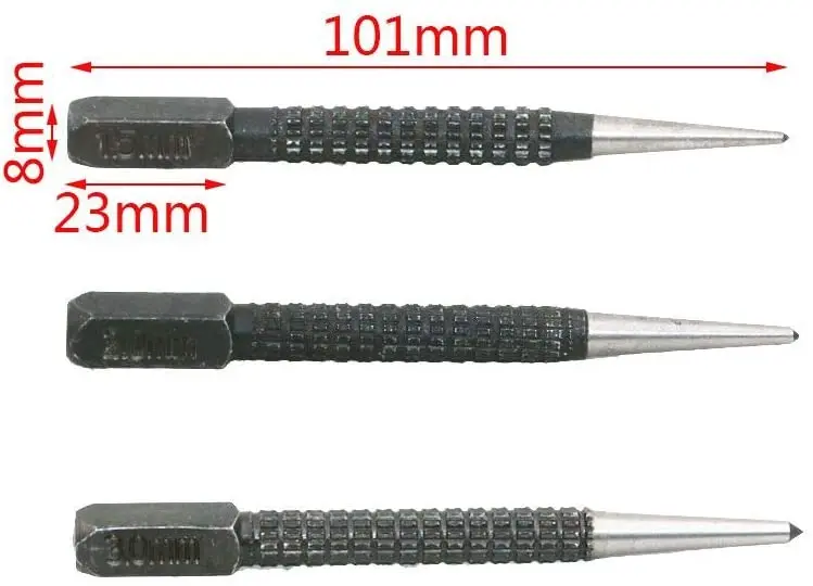 Спецификация:Новинка и высокое качествоМатериал: Высокоуглеродистая стальЦвет: черный и серебристыйДлина: прибл. 10 см/3,93"Размер головки: 1,5 мм/2 мм/3 мм/0,059 "/0,078"/0,11"Количество: 3 шт. Посылка включает в себя:3x центральный перфоратор Примечание: светильник и различные дисплеи могут привести к тому, что цвет товара на картинке немного отличается от реального. Допускается погрешность в измерениях +/- 1-3 мм.