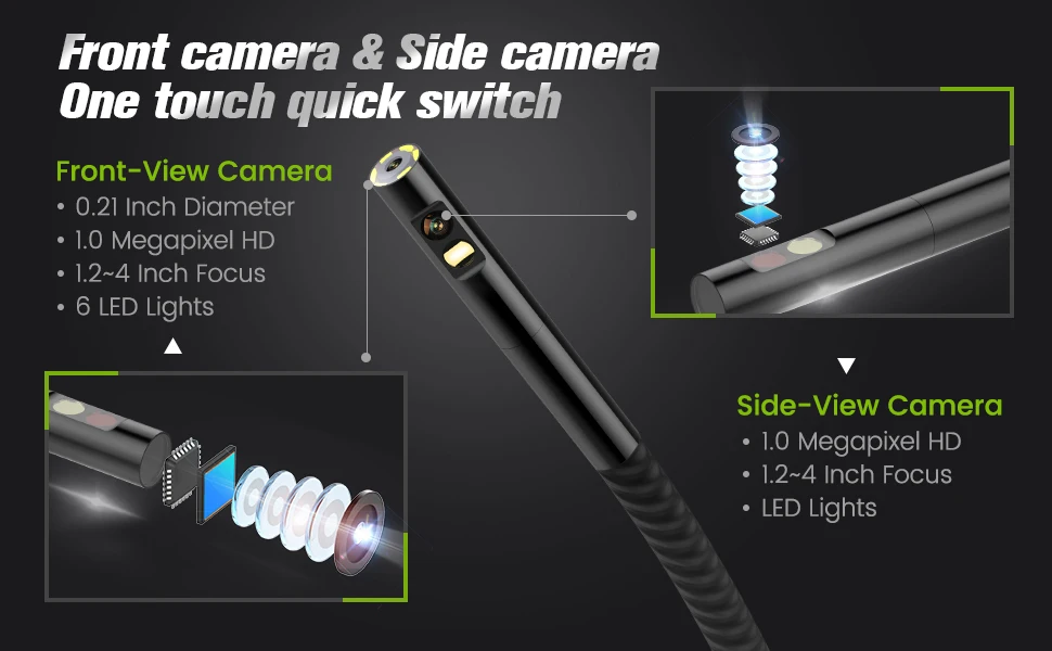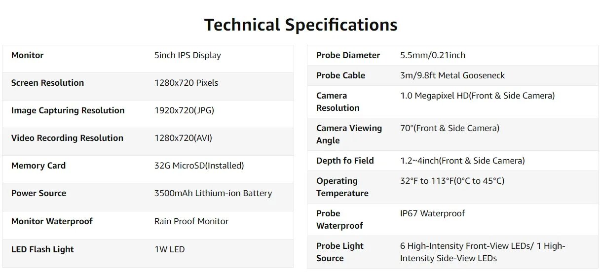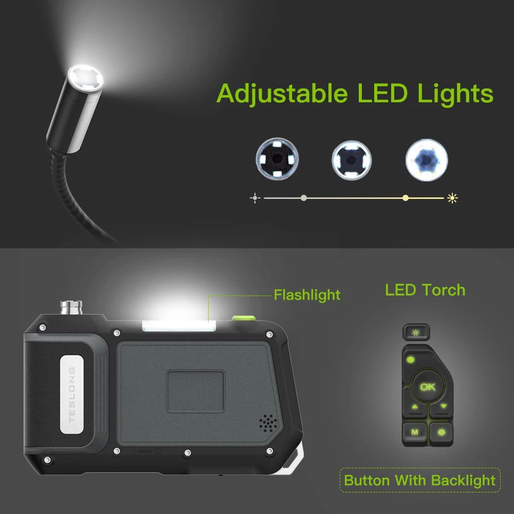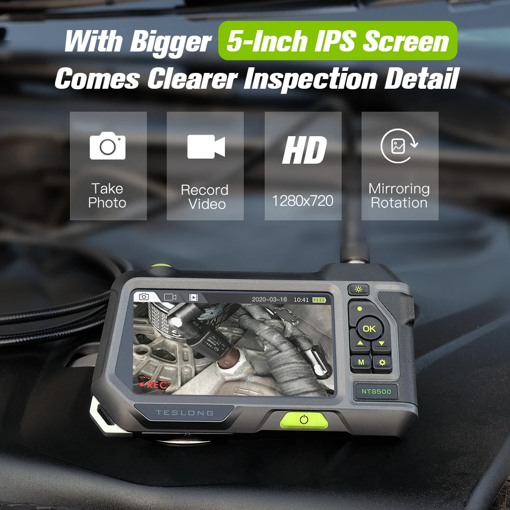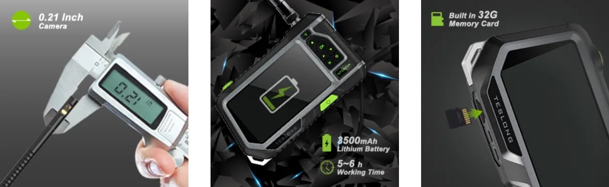 Экономьте время и деньги-это отличный инструмент для автоматического обслуживания, домашнего осмотра, электрических установок, HVAC исправлений и домашних DIY. 0,21 дюймовая эндоскопическая камера может легко пройти через отверстие свечи зажигания, чтобы проверить камеру сгорания двигателя. Или просто Просверлите отверстие на стене, чтобы войти в внутреннюю стену для просмотра, устраняя проблемы с разрушением стены.Большой экран-это самый большой Карманный эндоскопический экран на рынке с диагональю 5 дюймов с цветным ЖК-экраном 720p IPS и разрешением 1280x720 HD. Технология IPS делает этот экран более ярким для использования на открытом воздухе.Водонепроницаемость IP67-бороскоп имеет класс водонепроницаемости IP67 для использования в сложных погодных и влажных условиях. Зонд змеиной камеры использует аэрокосмический соединитель, который является безопасным для использования в бассейнах, водопроводе и дожде.Подходит для работы в темноте-шесть светодиодный ных ламп регулируются для яркости и дают Передняя камера идеальный вид на самые темные зоны осмотра. Боковая камера имеет собственный светодиодный светильник. С фонариком и кнопками подсветки, эндоскоп идеально подходит для работы в темнотеВ комплект входит карта памяти 32 Гб-запись аудио и видео-монитор контроля включает в себя карту micro SD, которая поддерживает изображение JPG и запись видео AVI, а также встроенный динамик и микрофон для записи голоса при съемке видео, что удобно для детальных проверок и просмотра видео позже.Перезаряжаемая литиевая батарея-включает перезаряжаемую литий-ионную батарею емкостью 3500 мАч, которая дает вам 5-6 часов рабочего времени в зависимости от вашего использования.