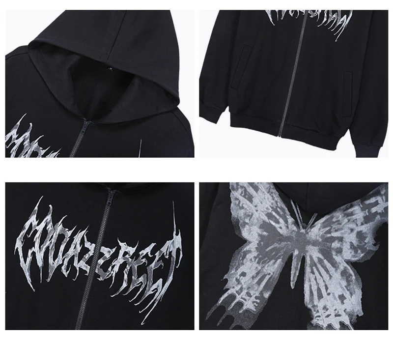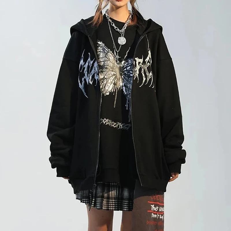 Женская толстовка с капюшоном Y2K, в стиле Харадзюку, с принтом бабочек, в стиле хип-хоп, в готическом стиле, на молнии, 2021