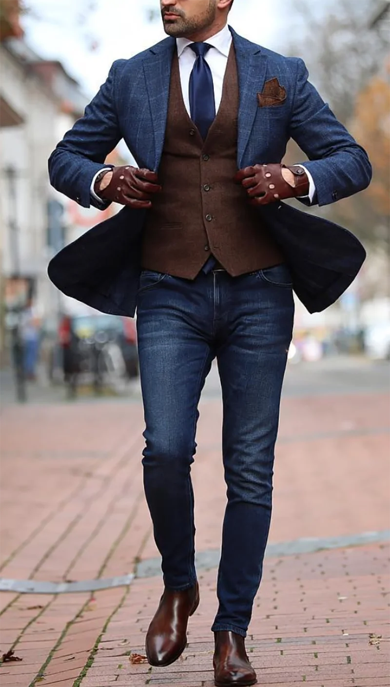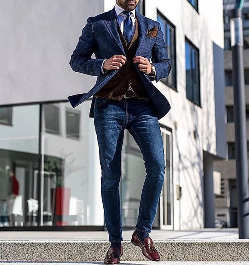 Мужские свадебные смокинги темно-синего цвета, 2 шт., блейзер и коричневый жилет, мужской костюм для жениха и жениха, повседневные мужские костюмы на заказ