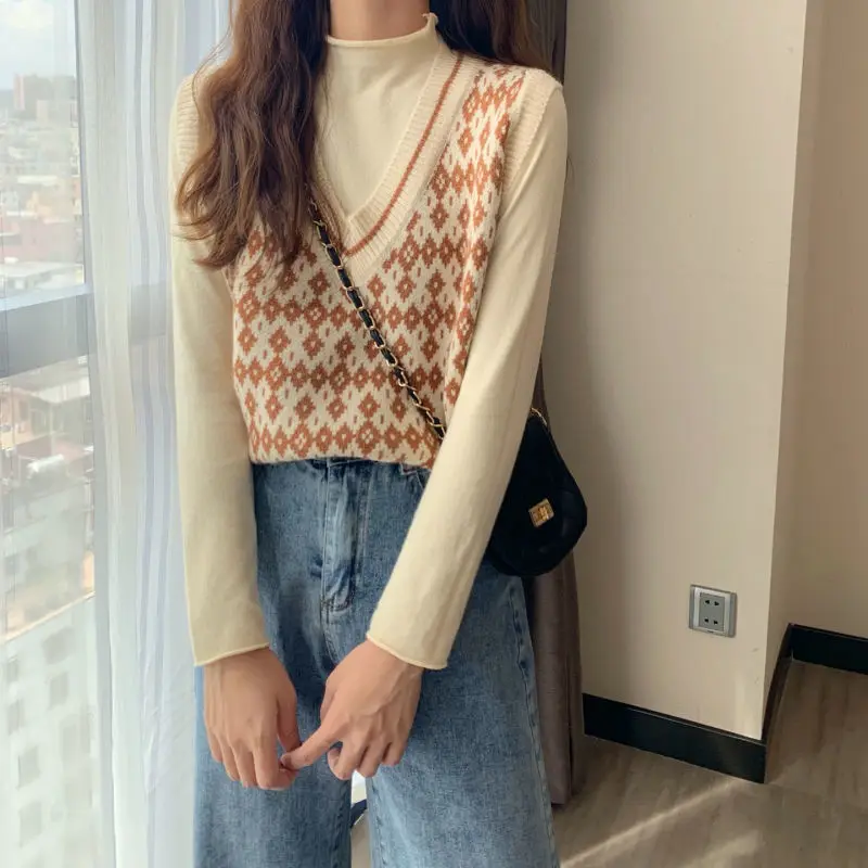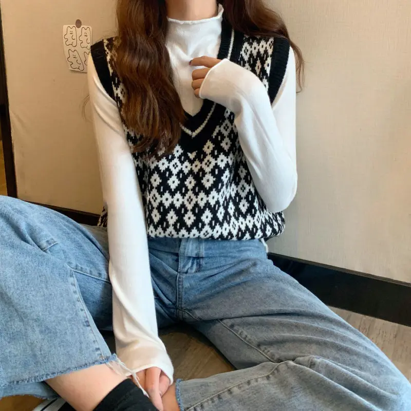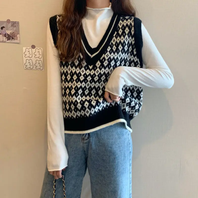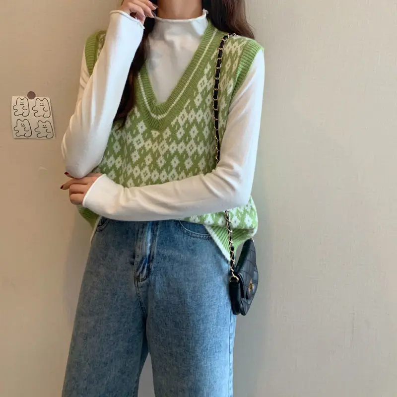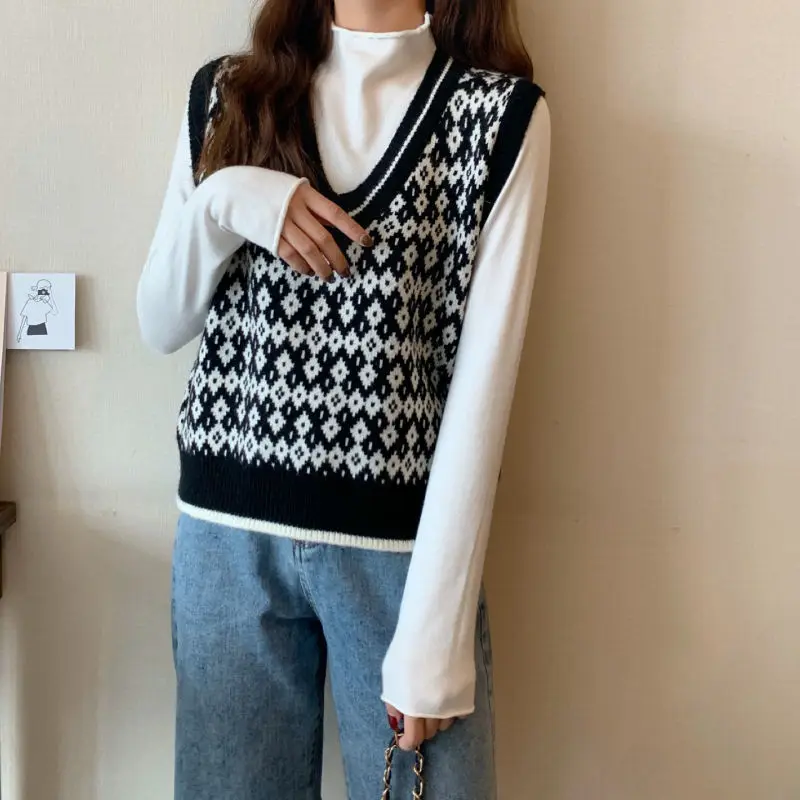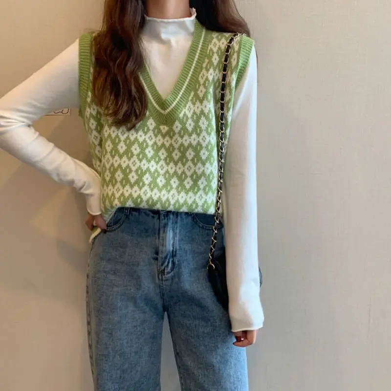 Женский пуловер с рисунком ромбиков, трикотажный топ оверсайз с V-образным вырезом, без рукавов, в Корейском стиле, 2021