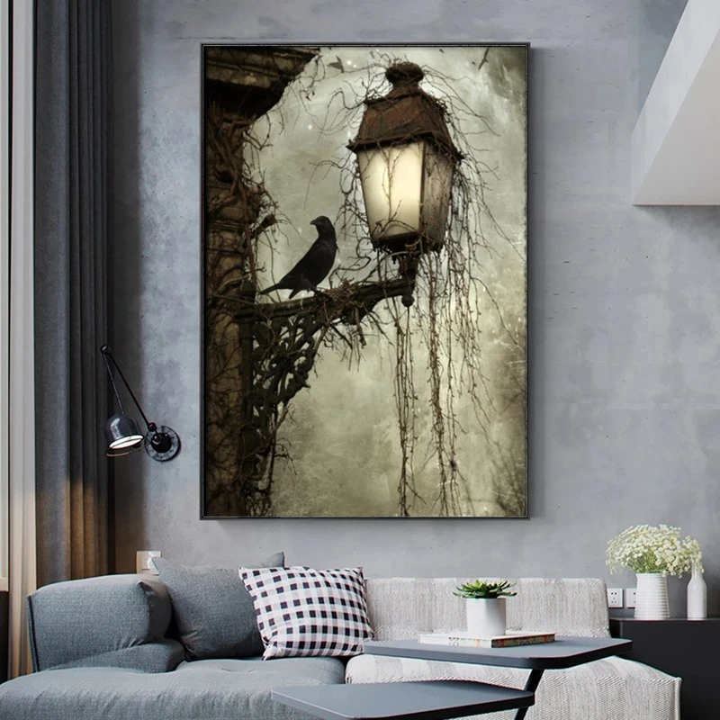 Винтажная Картина на холсте настенная лампа с изображением черной вороны и темный готический художественный узор в виде картины для украшения домашней гостиной