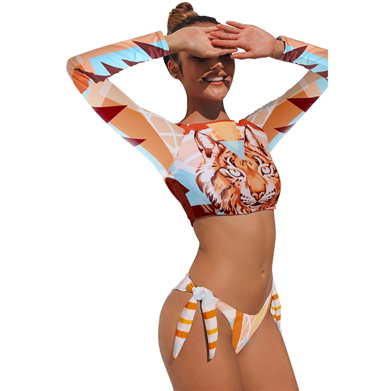Купальник для серфинга для женщин 2021, бикини с длинным рукавом, купальник с принтом тигра, пуш-ап, летний купальный костюм из двух частей, бандо, бикини