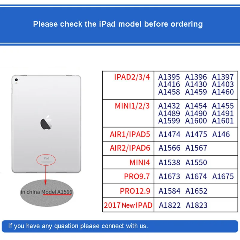 Для iPad 5/6 9,7 (2018/2017): A1822/A1823/A1893/A1954Для iPad Air 1 / 2:A1566/A1567/A1474/A1475/A1476Для iPad 2/3/4:A1395/A1396/A1397/A1416/A1430/A1458/A1459/A1460Для iPad Pro 9,7 (2016):A1673/A1674/A1675