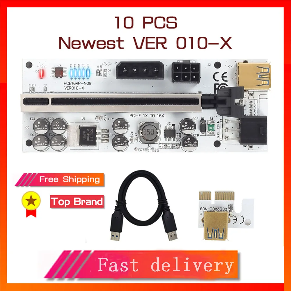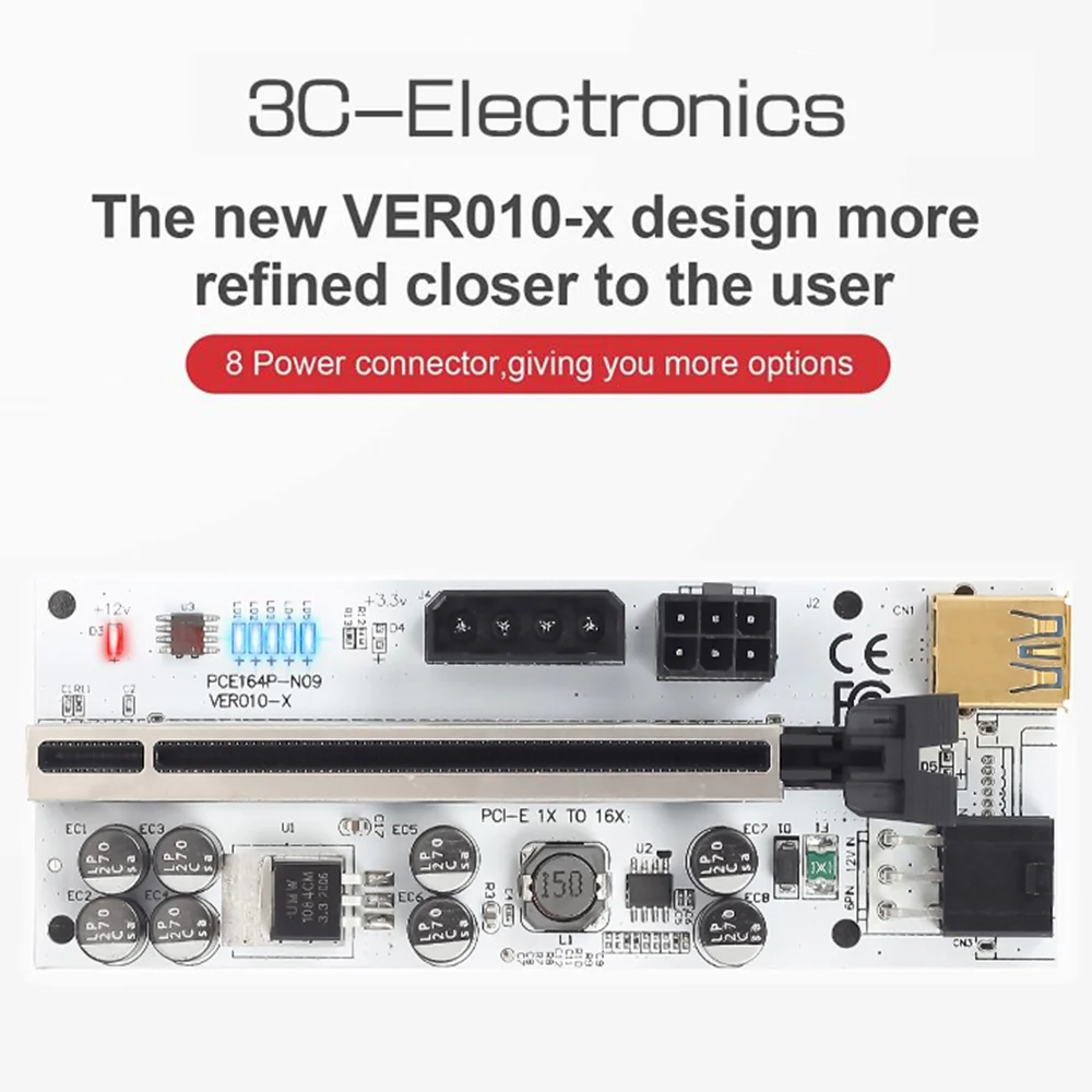 Совершенно новый 3C-Electronics 8 конденсатор PCI-E стояки 010-X.Это самые высококачественные GPU стояки на рынке со строгим контролем качества для обеспечения подключения и долгосрочной надежности. Все приспособления для шнуров изготовлены из более плотного и прочного пластика, что обеспечивает более тепловыделение. Наши доски толстые, что способствует долговечности и держанию карт без проблем. Пайка на нижней части каждой доски более обильная, предотвращая сокращение на досках и увеличивая долговечность во время добычи. Мощность через Molex или два разных 6-PIN входов на борту riser. На основной плате есть 6 светодиодный светильник s и один светодиодный светильник на чиповой плате 1X. Он может помочь шахтеру лучше контролировать неисправности.