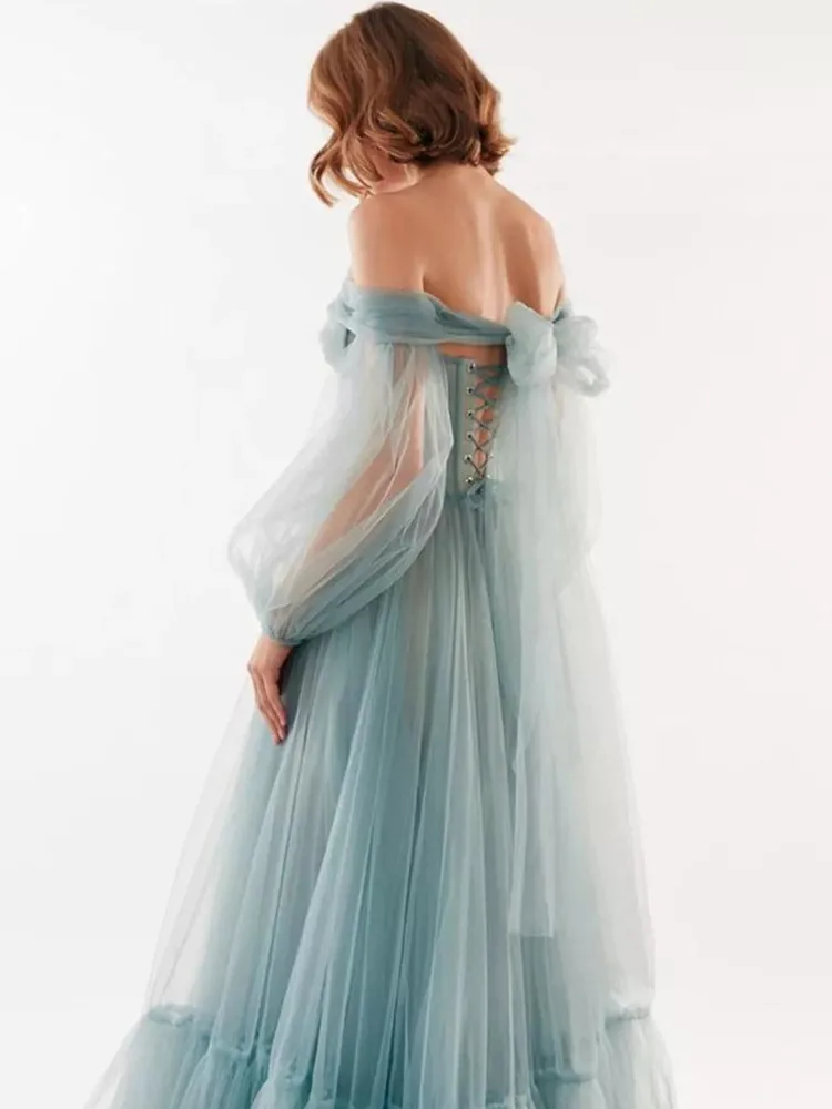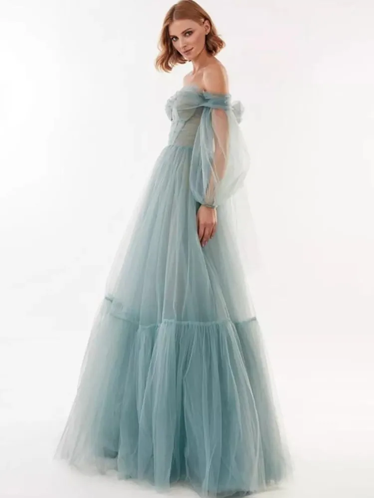 Элегантное пыльное синее вечернее платье с открытыми плечами, пышные платья для выпускного вечера, плиссированные вечерние платья из тюля с V-образным вырезом, Платья для вечеринок