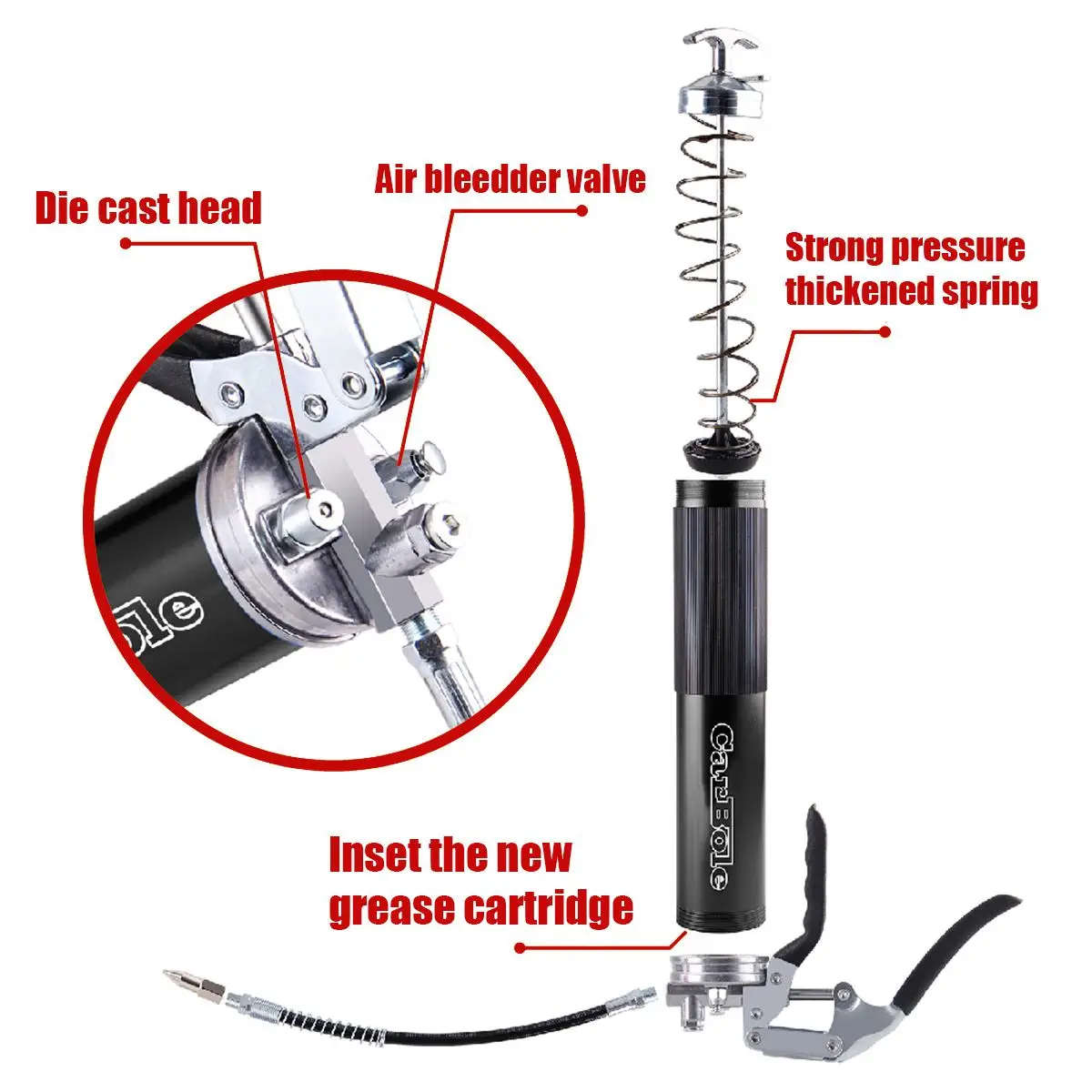 Особенности:-- Изготовлен из высококачественного материала, прочный и долговечный, который имеет долгий срок службы.-Текстурированная резиновая противоскользящая ручка, легко захватывается. Прорезиненная рукоятка для лучшего сцепления и рычага-- Он может накачивать масло со скоростью до 9000 фунтов на квадратный дюйм. С жесткой трубой и шлангом, что делает ее сантиметром для впрыскивания чистой смазки в некоторые очень плотные пространства.-Большая емкость, емкость 400 куб. См помогает вам работать лучше, быстрее и удобнее.-Супер сильное давление утолщенная пружина. Прочный, высокая эффективность и стабильная производительность.