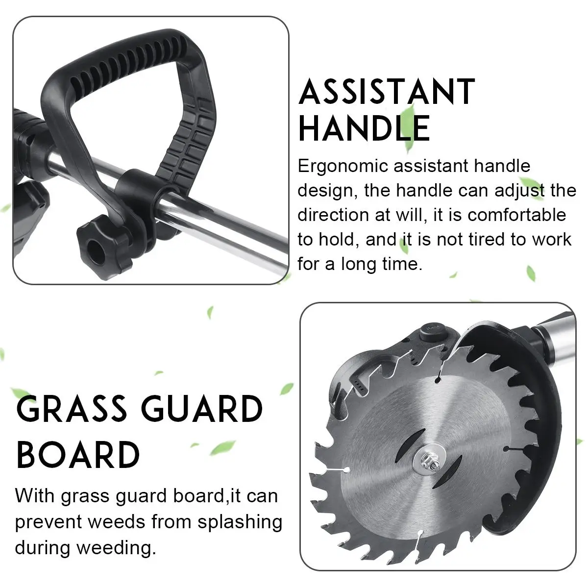 Особенности:-1580 Вт высокомощная водонепроницаемая и малошумная головка, легко моется.-Беспроводная Конструкция литиевой батареи, низкое энергопотребление и низкий уровень шума.-С травой щитком, он может предотвратить траву от брызг во время засорения.-Легко справиться с прихватками, маятниковой местностью, кромкой лужайки, цветком, под цветочной решеткой и другими зонами.-Косите траву на плоской поверхности, быстро обрежьте траву на лужайке, с гибким углом и быстро обрежьте стог сена.-Специальный забор для защиты растений может эффективно предотвратить травмирование цветников питомника, а специальные перегородки могут эффективно предотвратить брызги травы.-Двойной переключатель управления, два переключателя должны быть запущены нажатием нижней части в то же время, что безопаснее, чтобы предотвратить случайное касание.-Эргономичный дизайн ручки, ручка может регулировать направление по желанию, удобно держать, и она не устает работать в течение длительного времени.