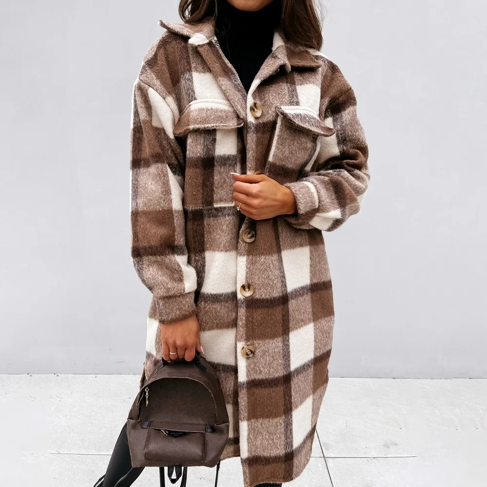 Женская клетчатая куртка в стиле оверсайз, тонкая длинная куртка с отложным воротником, в стиле ретро, зима 2021