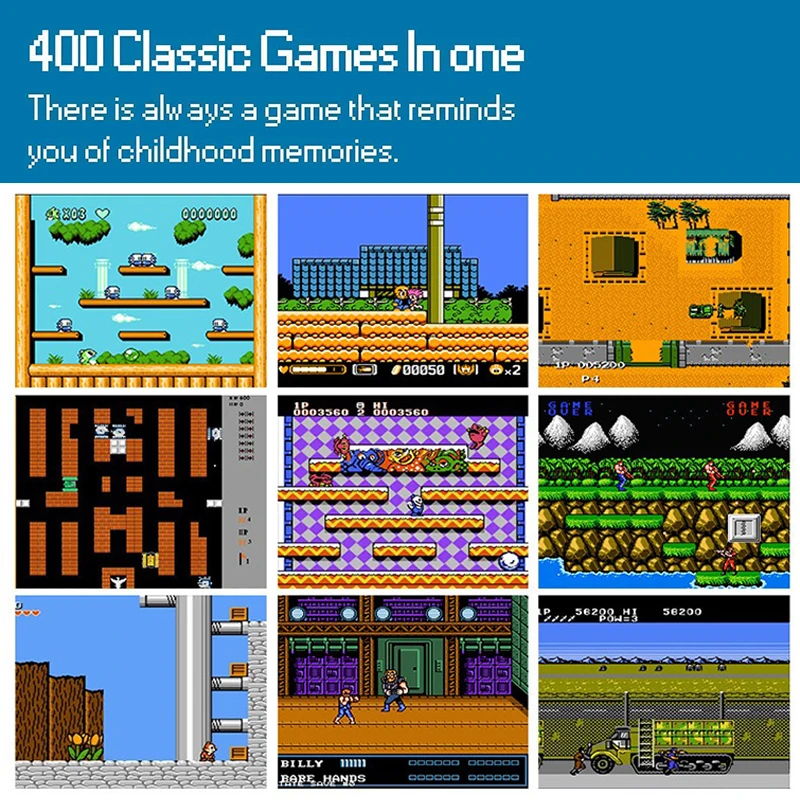 В эту игровую приставку встроено 400 различных классических игр. Включает в себя спортивные, Приключенческие и головоломки, а также мышление и обучение игры с памятью, математикой и логикой. В нем всегда будет что-то новое, чтобы развлечь, пока вы любите дома или в дороге.