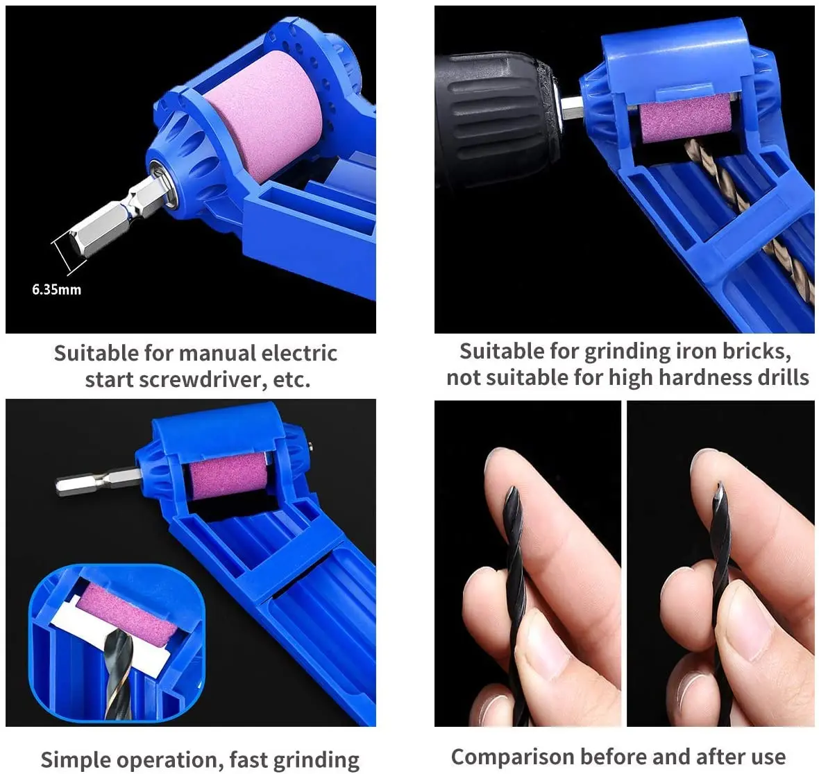Спецификация:Цвет: синий, оранжевыйМатериал: ABS & корунд шлифовальный кругФункция: быстрый и простой способ заточить сверлоКоличество упаковки: как на картинкеРазмер продукта:Посылка:Вес:Особенности:1. Используйте электросверлильный привод, износостойкий корунд шлифовальный круг для улучшения скорости бит.2. Применимый размер сверла: 5/64 " - 13/64" (2 мм-5 мм) 7/32 " - 21/64" (5 мм-8 мм) + 11/32 "-1/2" (8 мм-12,5 мм), угол и ширина может быть отрегулировано. Угол и ширина можно регулировать.3. Простой и безопасный способ заточить сверло4. Маленькие и портативные, практичные инструменты5. Лучший выбор для новичков и мужчинПосле использования поместите в сухое и чистое место. Не используйте с суровыми химическими веществами, это может уменьшить срок службы.Примечание:1. Все размеры измеряются вручную и могут быть небольшие отклонения.2. Мы гарантируем наилучшее качество продукции и самое лучшее обслуживание, если возникнут какие-либо проблемы, вы можете связаться с нами, мы предоставим вам различные решения на ваш выбор.3. Безопасно использовать в соответствии с инструкциями.4. После использования поместите сверлильный резец в место, которое недоступно для детей, чтобы не повредить острые части детей.