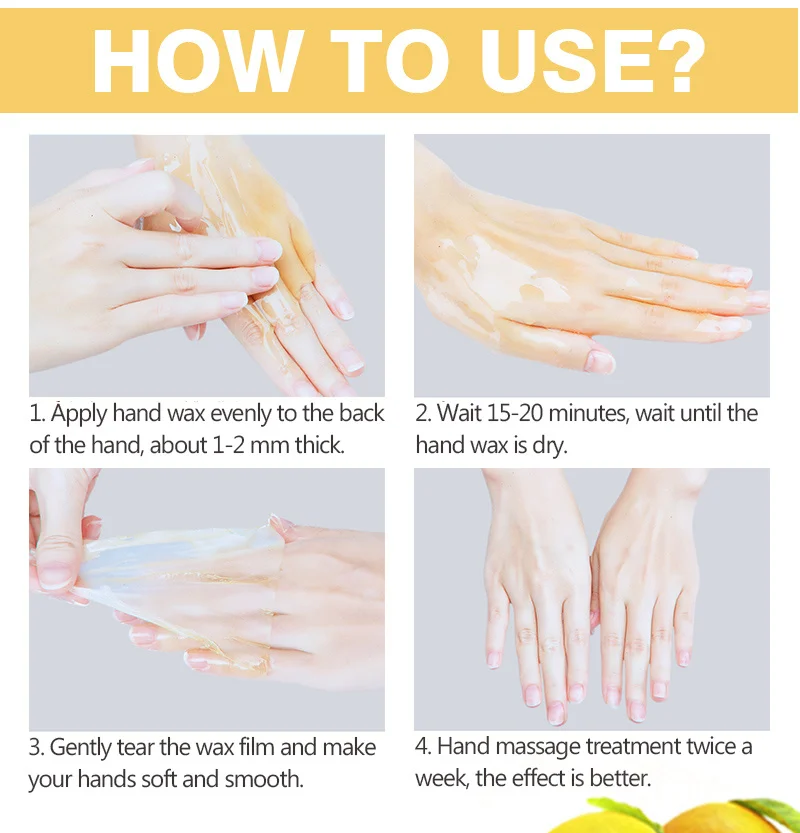 1. После очистки и сушки рук нанесите соответствующее количество на руки и кожу равномерно,2. Оставьте на 15-20 минут, пока восковая эссенция не впитывается и не высушивается в пленку.3. Затем удалите воск и краску чистой водой.