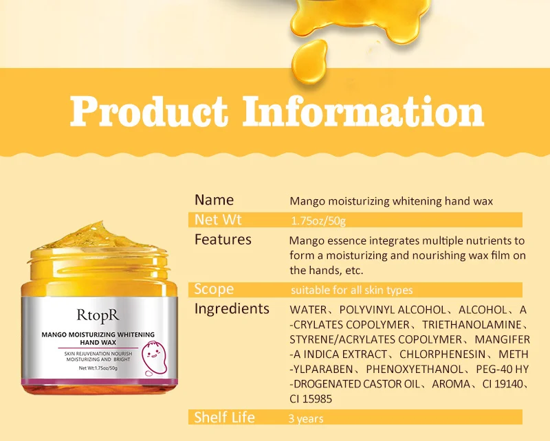 Название: увлажняющий отбеливающий воск для рук мангоВес нетто: 1. 75 унций/50 гОсобенности: эссенция манго объединяет несколько питательных веществ для формирования увлажняющей и питательной восковой пленки на руках и т. д.Область применения: подходит для всех типов кожиСостав:Вода, поливиниловый спирт, спирт, акрилатный сополимер, триэтаноламин, стирол/акрилатный сополимер, MANGIFERA INDICA экстракт, хлорфенолин, метилпарабен, феноксиэтанол, PEG-40, гидрогеновое масло, 19140 CI 15985Срок годности: 3 годаПодходящая кожа: разнообразие кожи.Примечание: Если вы обнаружите дискомфорт кожи, пожалуйста, прекратите использование.Состояние хранения: пожалуйста, держите подальше от светильник, чтобы избежать прямой солнечный светильник.