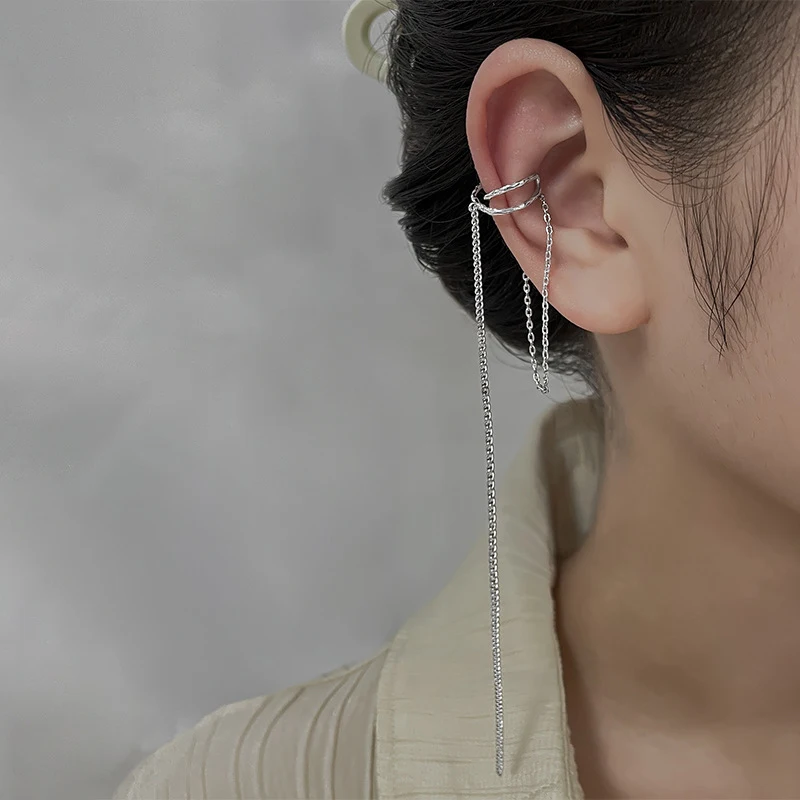 Женские серьги в стиле панк, серебряные, длинные, с кисточками, с манжетами, корейские, модные, для девушек, висячие, на клипсах, винтажные, поддельные, пирсинг, ювелирные изделия