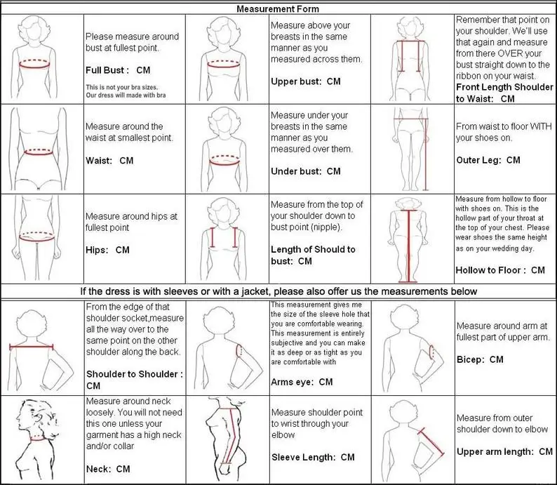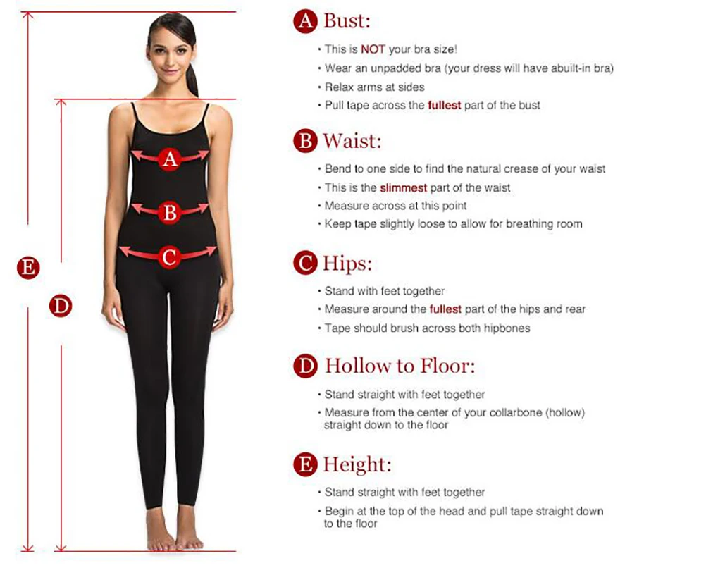 If the sizes offered do not fit you, we provide custom made service, email us the following measurements:1. Full Bust:_____cm/inches2. Full Waist:____cm/inches3. Full Hips:_____cm/inches4. Shoulder(Hollow) to Floor(Hem):____cm/inches5. Barefoot Height from Head to Toe:____cm/inches6. Heels:____cm/inches7. The date you need the dress:____But Custom made dress is not acceptable to return or exchangeand Very large sizes will have extra custom made fee