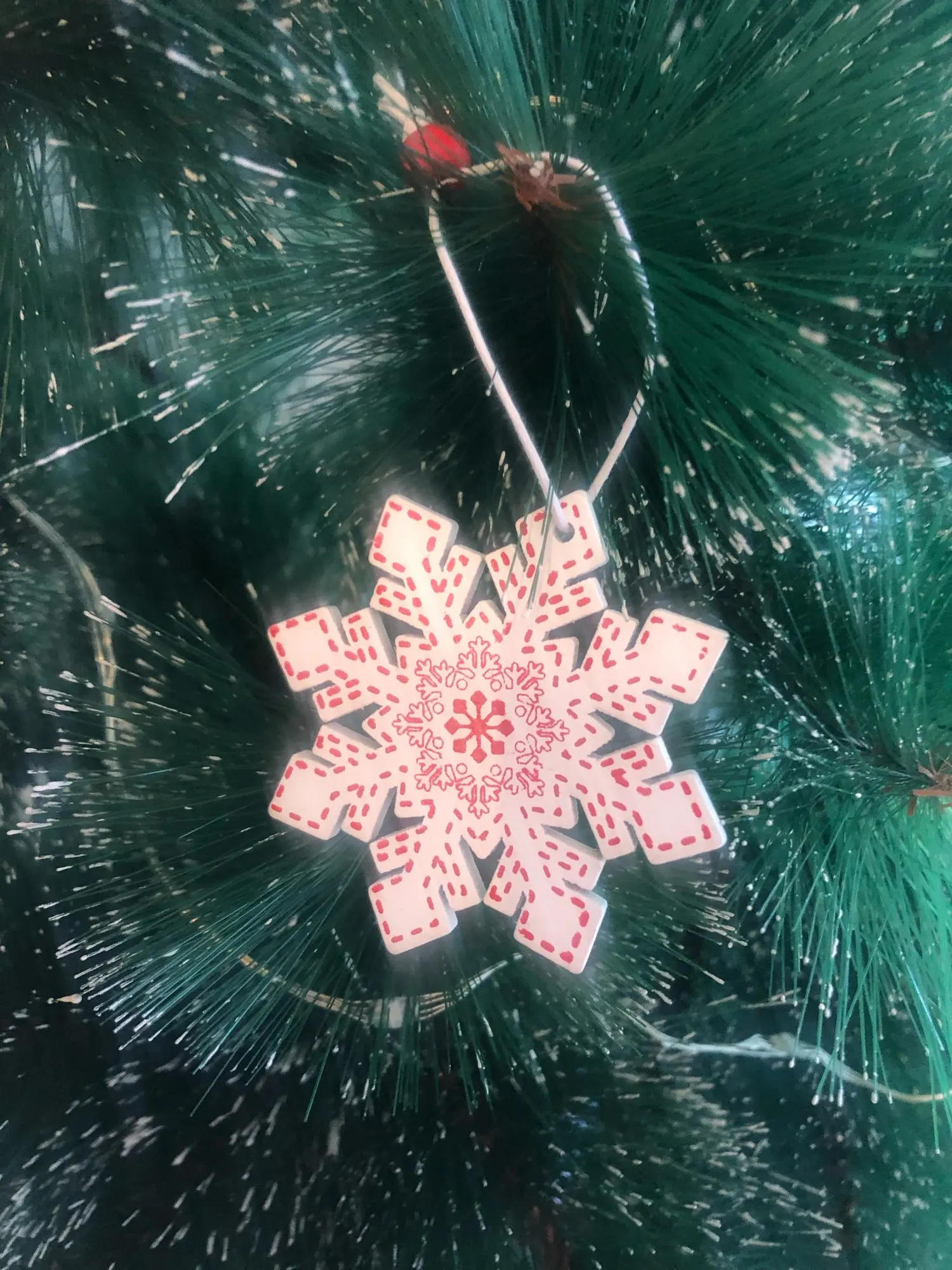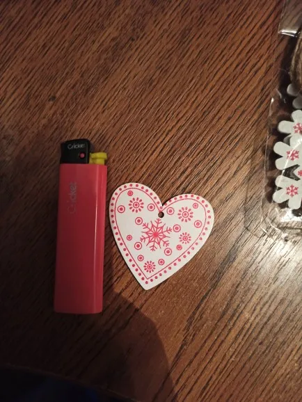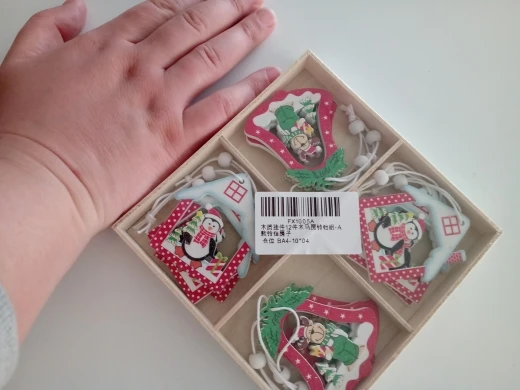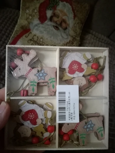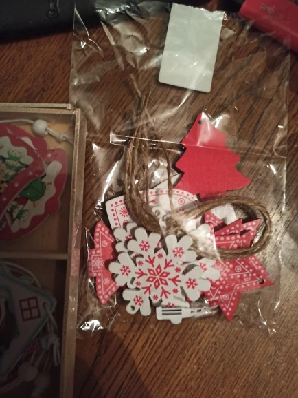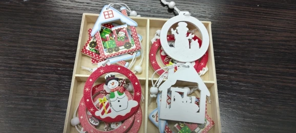 Внешне упаковка целая, видно небольшое количество опилок, на первый взгляд прокрашено хорошо, верёвочки, чтобы повесить на елку на игрушках есть