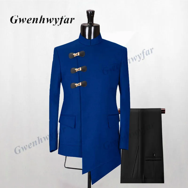 Мужской костюм Gwenhwyfar с кожаной пряжкой, в африканском стиле, нестандартной длины, королевский синий пиджак, черные брюки, приталенный вечерний смокинг
