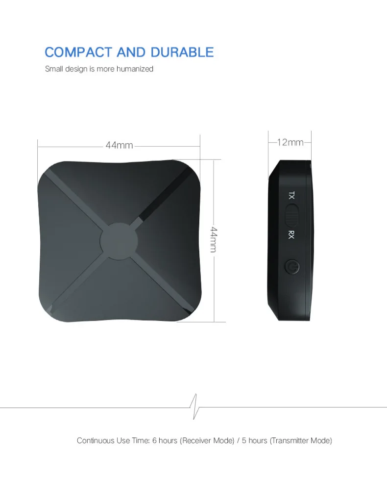 * Этот Чрезвычайно портативный, легкий беспроводной аудио передатчик и приемник-идеальное беспроводное аудио решение для широкого спектра ситуаций и использования* Режим передатчика: Беспроводная передача аудио с вашего телевизора без Bluetooth, домашней стереосистемы или CD-плеера на наушники или колонки Bluetooth* Режим приемника: Беспроводная передача аудио с телефона, планшета или компьютера с поддержкой Bluetooth на проводную стереосистему, динамики или наушники* Переключение между режимами передатчика и приемника с простым щелчком переключателя. Легко подключить, используя передовые технологии Bluetooth и 3,5 мм аудио кабель (все указанные аккумуляторы входят в комплект поставки).* Супер-Портативное аудио-потоковое питаниеKN319 всего 44 мм (1,73 дюйма) и весит всего 18 г (0,63 унций), но имеет мощные возможности беспроводной потоковой передачи аудио. Вставьте этот передатчик и приемник в рюкзак или сумку для ноутбука и возьмите его на ходу без каких-либо усилий.* Широкий Совместимость: с помощью прилагаемого 3,5 мм кабель и 3,5 мм до 2RCA кабель, этот приемник передатчик адаптер может широко использоваться на вашем компьютере, ноутбук, домашней стереосистеме, бумажное полотенце, кабель для наушников, смартфон, mp3-плеер, CD-плеер и т. Д.
