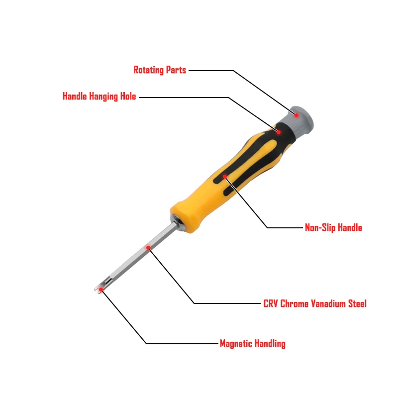Особенности:Отвертка из хромированной ванадиевой стали CR-V, ручка изготовлена из материала защиты окружающей среды PP, а стержень отвертки магнитный, который может поглощать винты.Тип бит: y-образный, t-образный, u-образный, в форме звезды, в форме Креста, прямой (Применимо к: цвету сливы, треугольнику, кресту, y-образной форме, пятиугольные, u-образные и плоские винты)Область применения: подходит для всех видов небольших и средних электроприборов и ремонта бытовой техники. Это незаменимый маленький инструмент для повседневной жизни.Его можно использовать для ремонта компьютеров, ремонтных выключателей, ремонта цифровых приборов, печатных плат, небольших бытовых приборов и других операций.