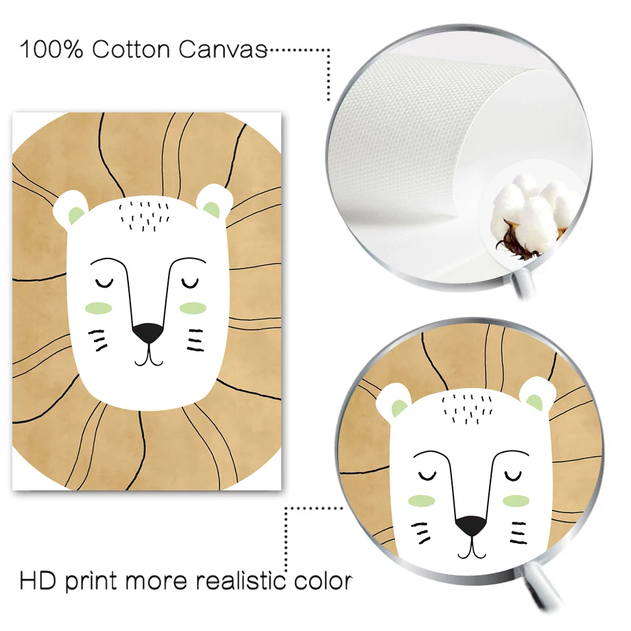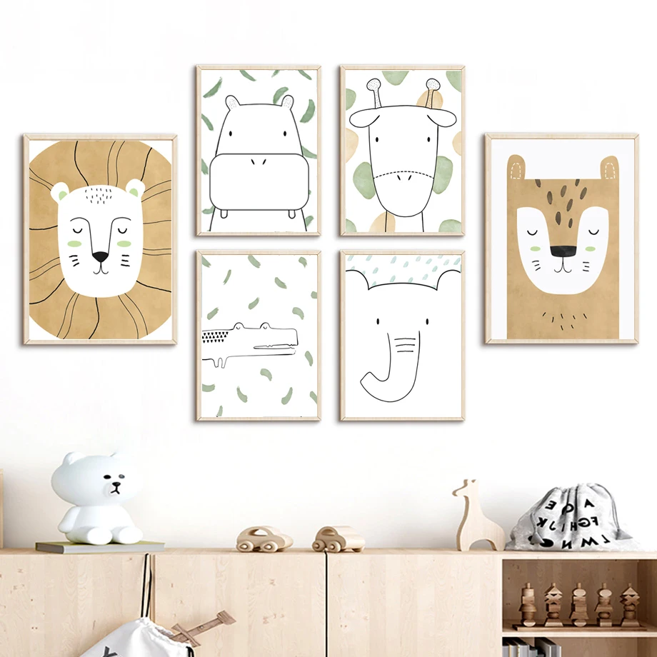 Лев, жираф, слон линия животных Детская настенная Картина на холсте...