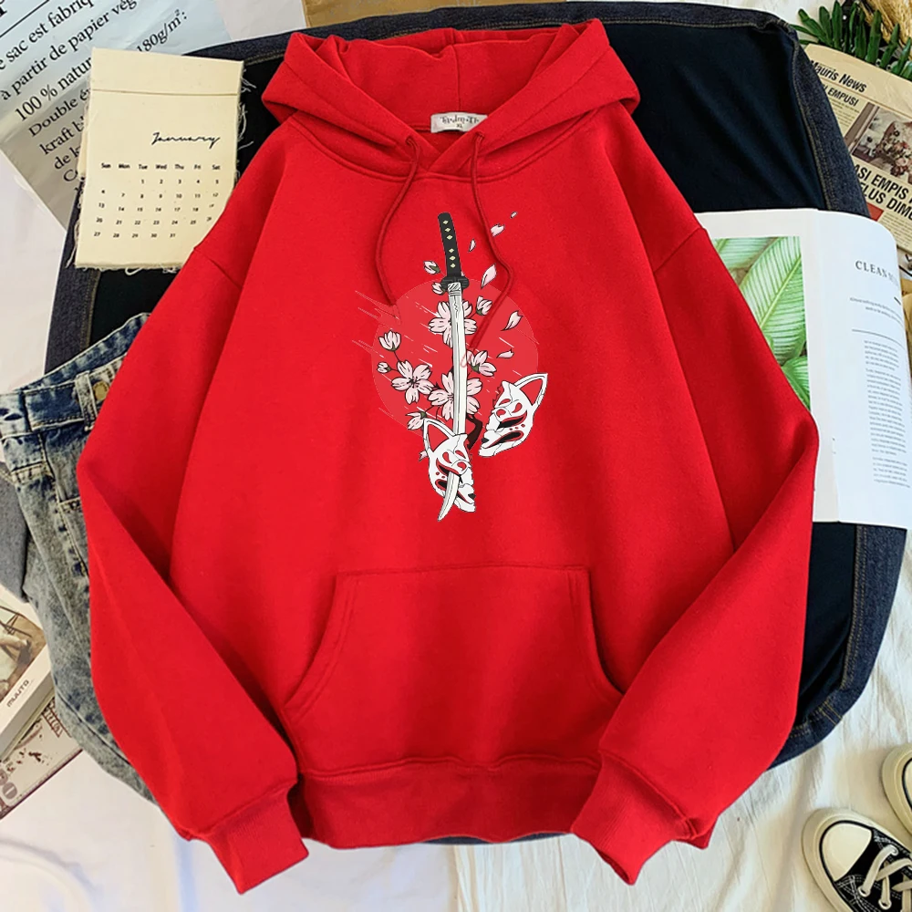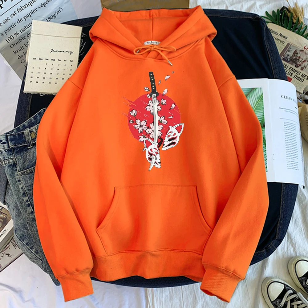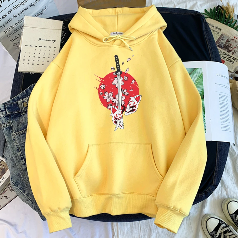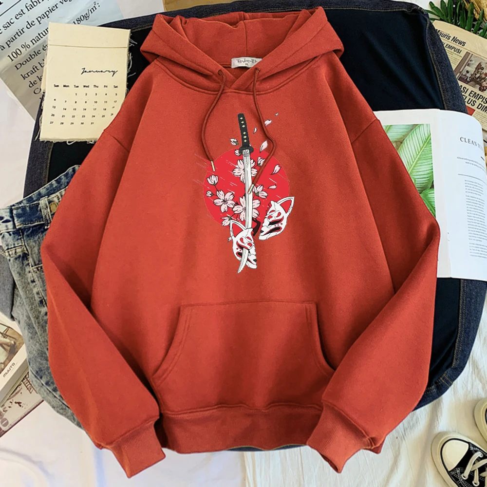 Японский самурайский меч и маска в цвету вишни, толстовки с принтом, женская толстовка большого размера с круглым вырезом, женские топы с капюшоном Harajukua