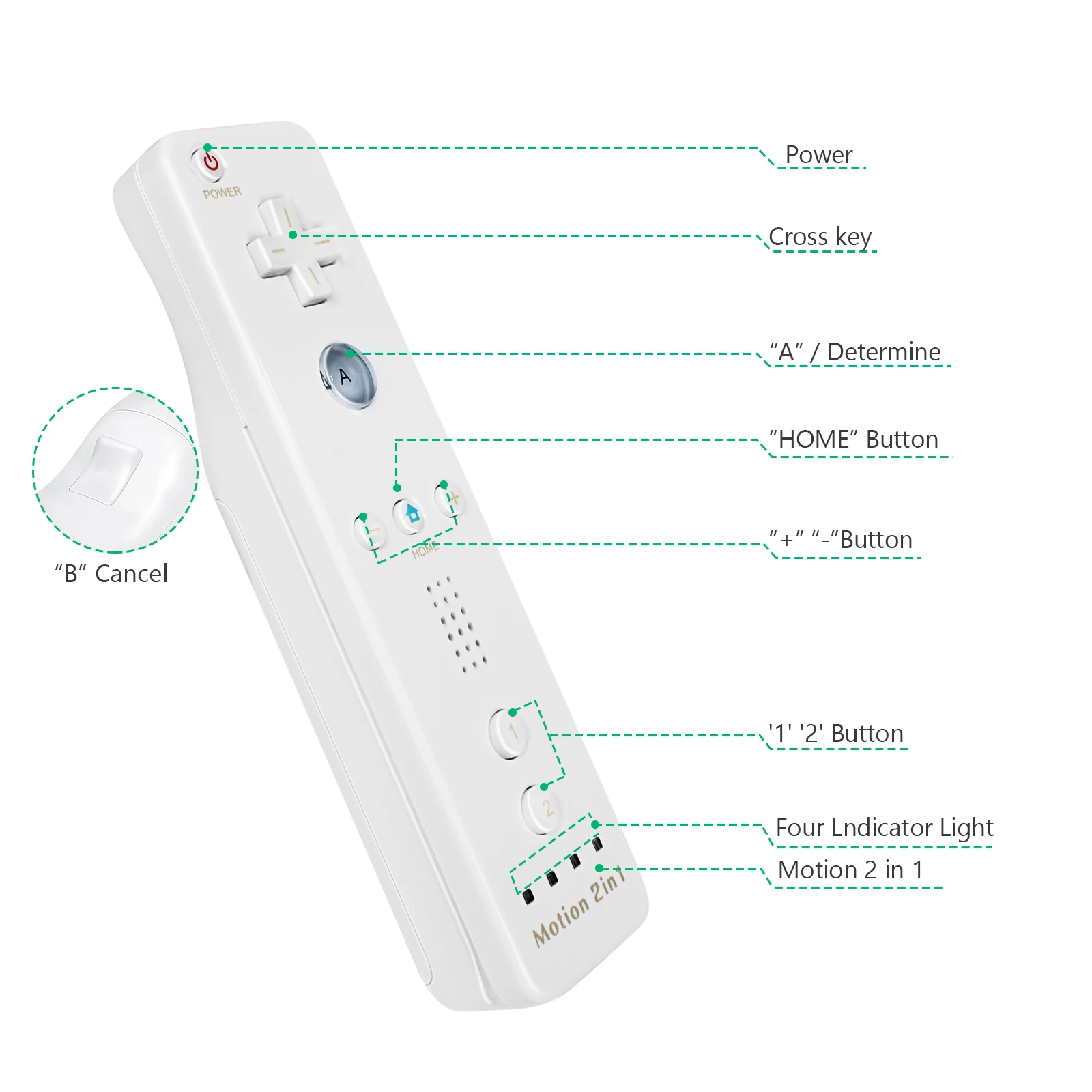 Обнаружить при помощи инфракрасного излучения, светильник из Сенсор бар, получить движение информации Светильник Спот, а также обеспечивают индикатор Bluetooth информация о движении. Поддержка функции переключения чувствительности хоста, встроенная звуковая группа использует интерфейс связи Slave IIC, а хост Wii передает отобранные аудио данные 6 кГц на пульт Wii через интерфейс связи Bluetooth, И декодирует Аудиоданные 6 кГц ADPCM через MCU усилителя класса D., Воспроизведение звука через динамик.