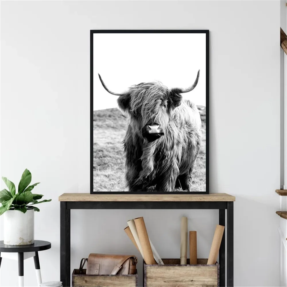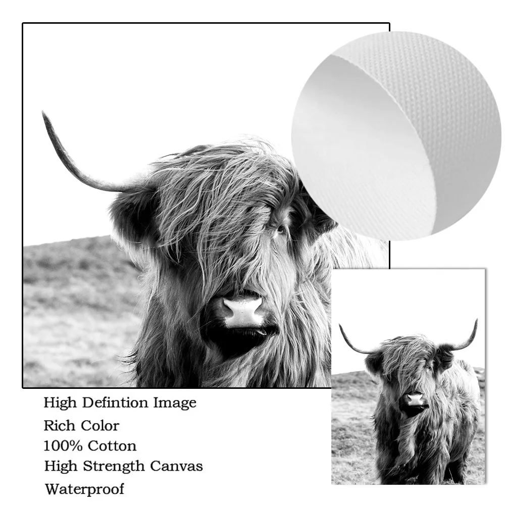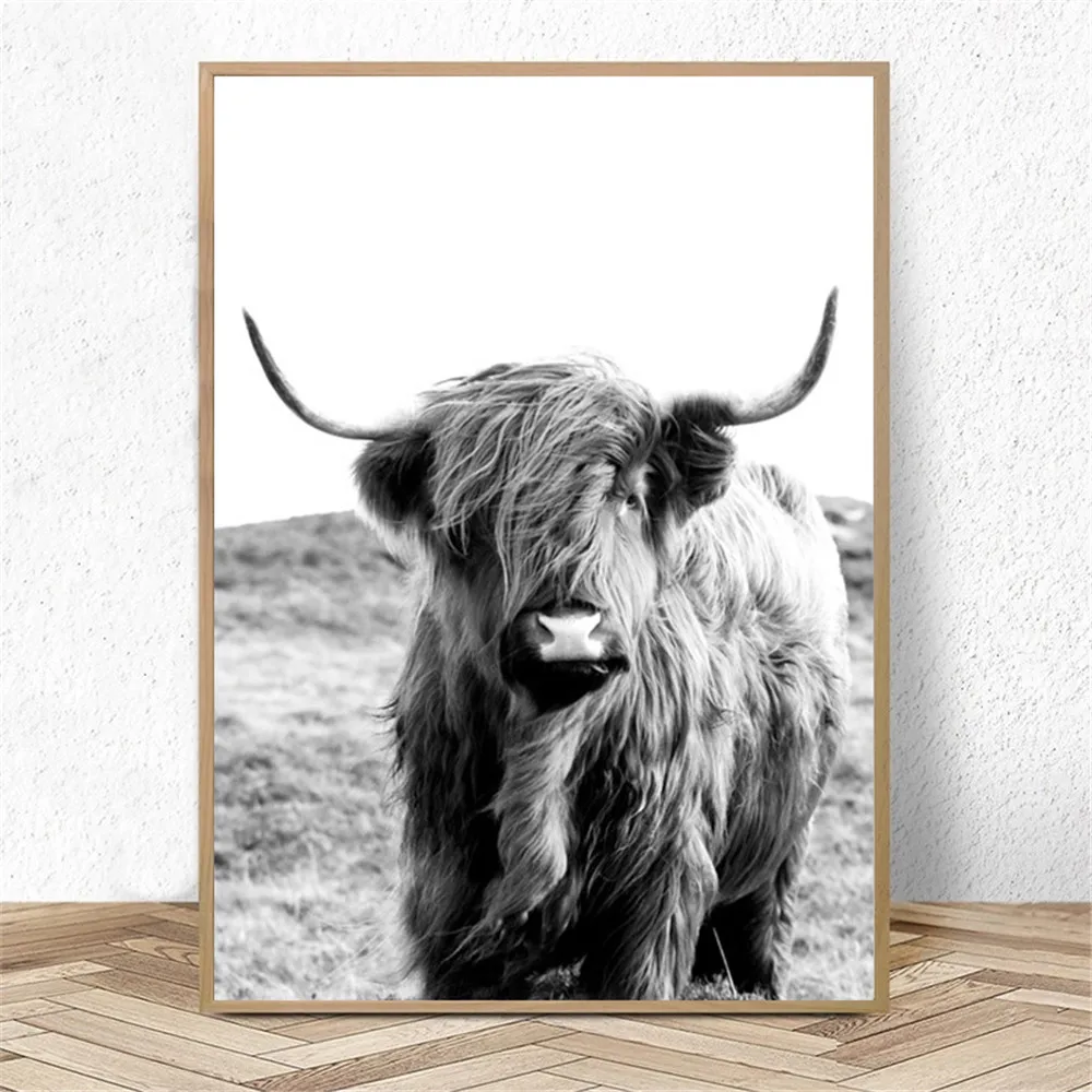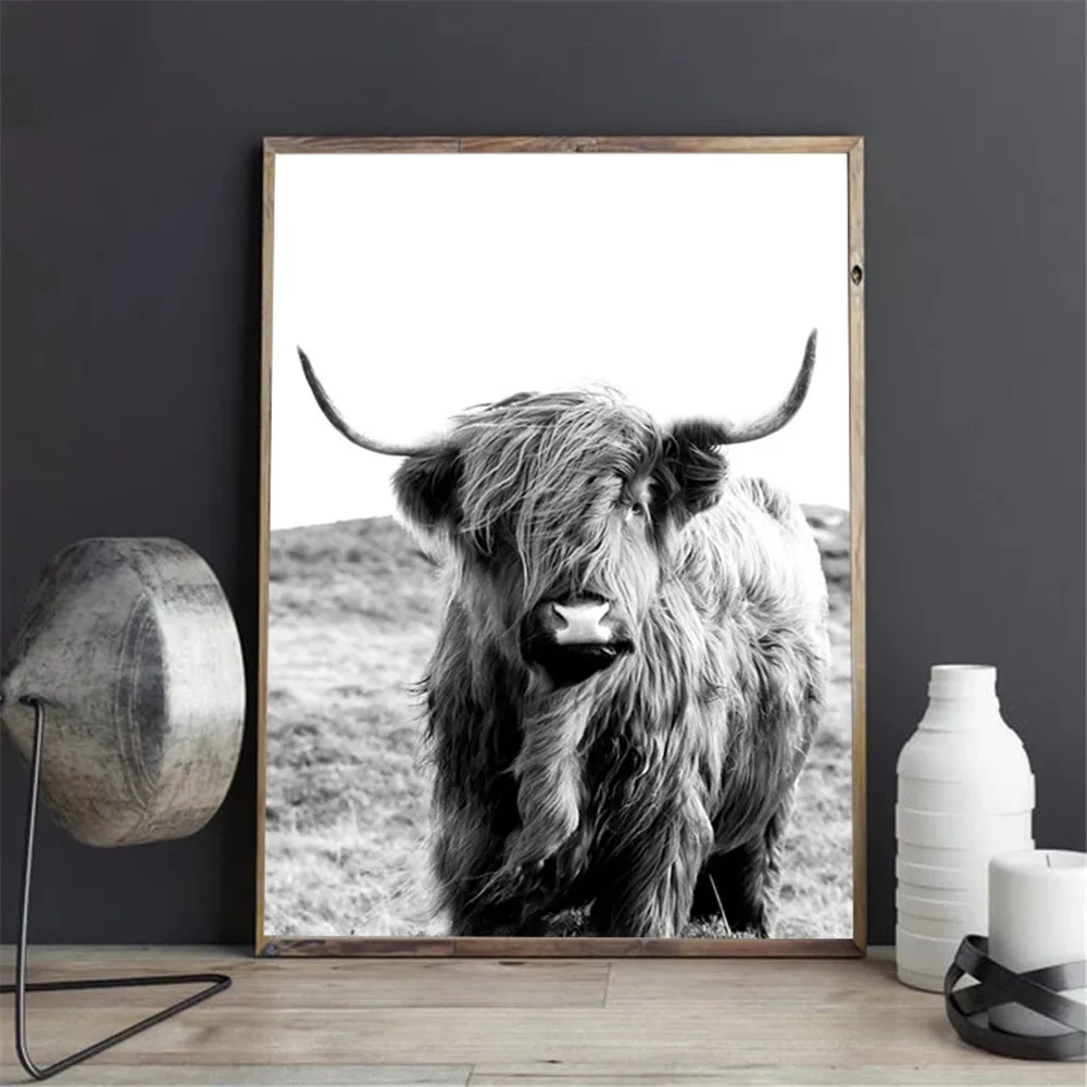 Черно-белый постер Highland Cow Печать на холсте ферма животные настенная живопись фермерские настенные картины гостиная домашний декор