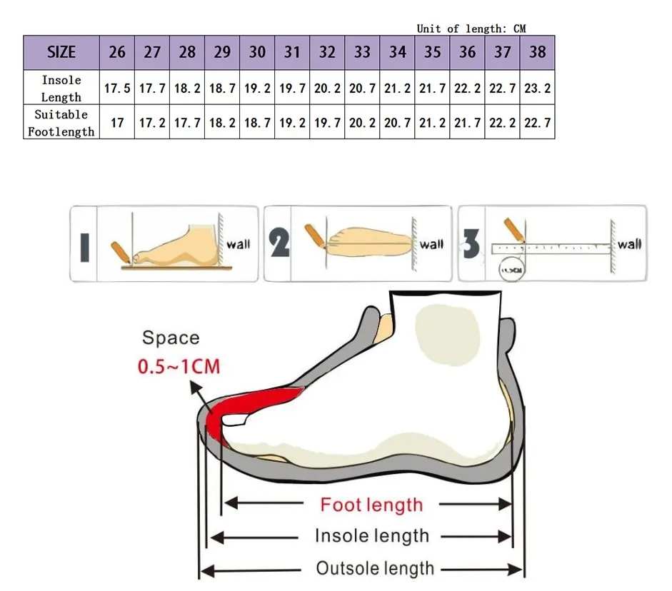 1. Пожалуйста, не измеряйте длину стельки, это не длина стопы.2. При измерении длины стопы, поэтому, пожалуйста, добавляйте еще один длиной около 0,5 см. Ребенок быстро растет, и мы скорее выберем обувь на размер больше.3. Выберите правильный размер в соответствии с нашей таблицей размеров.