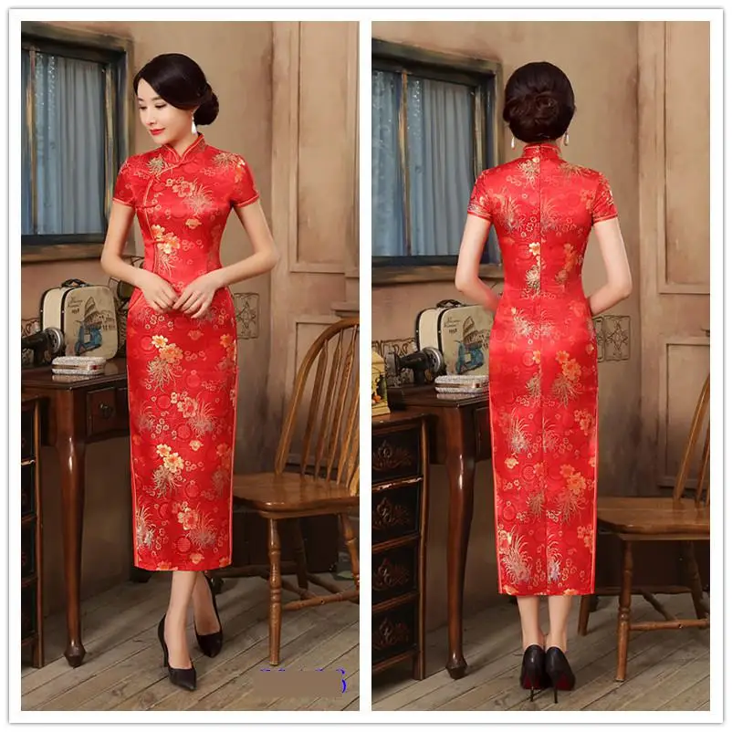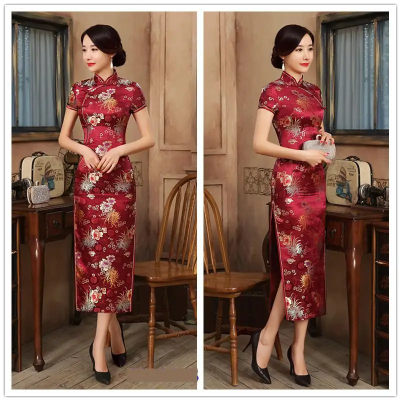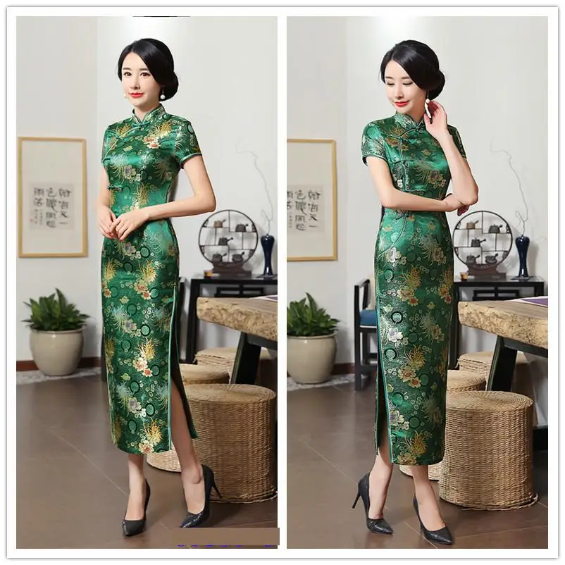 Женское атласное платье с принтом, элегантное восточное платье с воротником-стойкой и винтажными пуговицами, платье Ципао для выпускного вечера