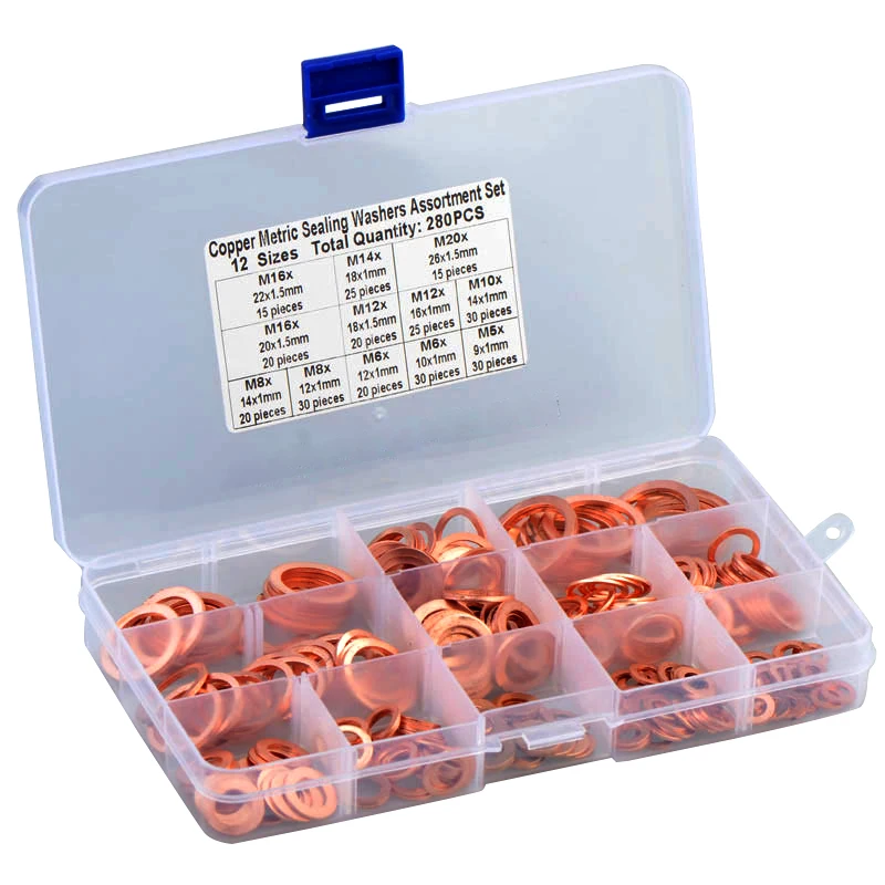 280 шт. M5 M6 M8 M10 M12 M14 M16 M18 M20 медная шайба уплотнительное твердое уплотнительное кольцо Набор для сливных вилок аксессуары Особенности: 280 шт. водопроводная сантехника гаражный двигатель Ассорти сливная вилка твердая медь шайба комплект Высококачественный медный материал, температура плавления до 1083 ℃. Хорошая Электропроводность и теплопроводность. Отлично подходит для штепсельных вилок, воды, топлива и гидравлических фитингов. Шайба пробки поддона набор для всех типов двигателей будь то автомобиль, морской, генераторы, машины и завод. Все содержится в компактном и просвечивается через разделенный пластиковый корпус. Размер: (I/D x O/D x Глубина) M5 * 9*1 мм 30 шт. M6 * 10*1 мм 30 шт. M6 * 12*1 мм 20 шт M8 * 12*1 мм 30 шт. M8 * 14*1 мм 20 шт M10 * 14*1 мм 30 шт. M12 * 16*1 мм 25 шт. M12 * 18*1,5 мм 20 шт M14 * 18*1 мм 25 шт M16 * 20*1,5 мм 20 шт M16 * 22*1,5 мм 15 шт M20 * 26*1,5 мм 15 шт