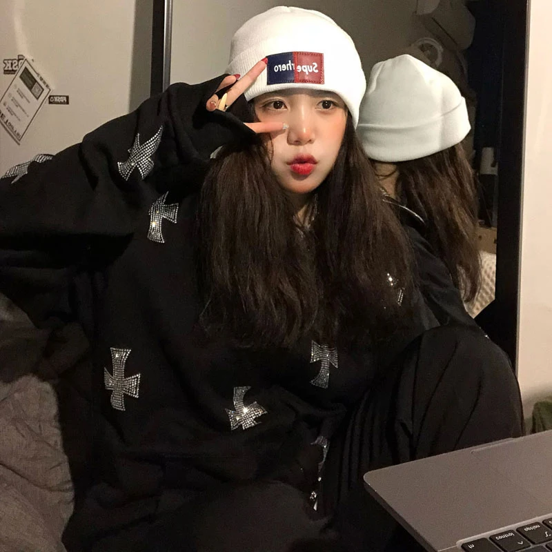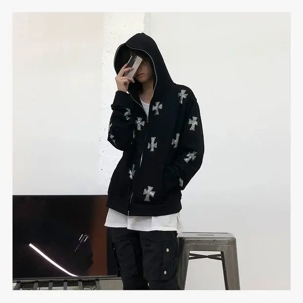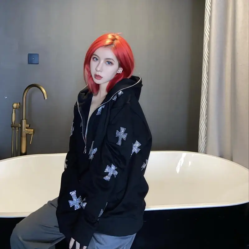 Мешковатая Толстовка в стиле хип-хоп, модная женская куртка, осень 2019, стразы Y2k, толстовка на молнии, Goth 90s, винтажная куртка с длинным рукавом для мужчин
