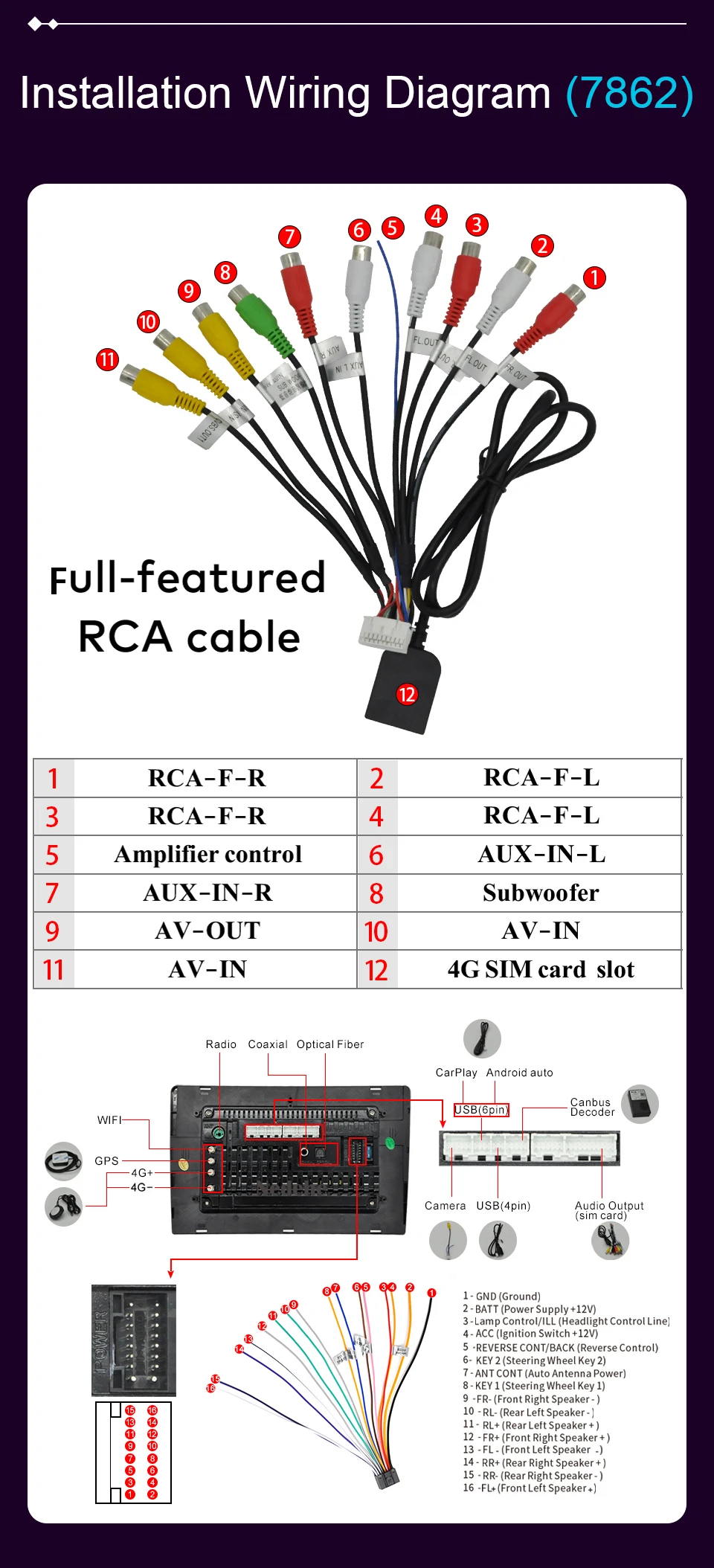 Основные функции:1,Bluetooth для handfree, телефонная книга2. Воспроизведение музыки с bluetooth(A2DP)3. Поддержка обратной камеры/запись привода DVR от заднего USB:4,OBD и Mirrorlink: Поддержка5, холодный старт около 17 секунд6. Встроенный микрофон: Поддержка7. Управление рулевым колесом: Поддержка8,Wi-Fi: Встроенный/через телефон в качестве Wi-Fi горячей точки.9, поддержка приложений: многие, например: Google Play Store, Skype, Facebook, YouTube, Twitter,waze и т. Д.11, поддержка 1080P + Поддержка музыки без потерь12, встроенный интернет 4G (не входит в комплект sim-карты), только 7862 версия поддерживает функцию 4G12: поддержка GPS карты, такие как Google online MapYandex.navi/Waze on Line CityGuide.13, мульти OSD Languaes: английский/русский/французский/немецкий/испанский/итальянский/арабский/Португальский/Турецкий/тайский/Польский/иврит и т. Д. 180 + язык14, этот блок не имеет dvd-механизма и не может воспроизводить dvd-диски. Название этого устройства-dvd-плеер, но на самом деле это полноэкранный автомобильный блок. Перед покупкой, пожалуйста, узнайте об этом15. Выберите логотип автомобиля, который вам нравится.16,Rca кабели для сабвуфера17, легко невысокий, просто подключите напрямую