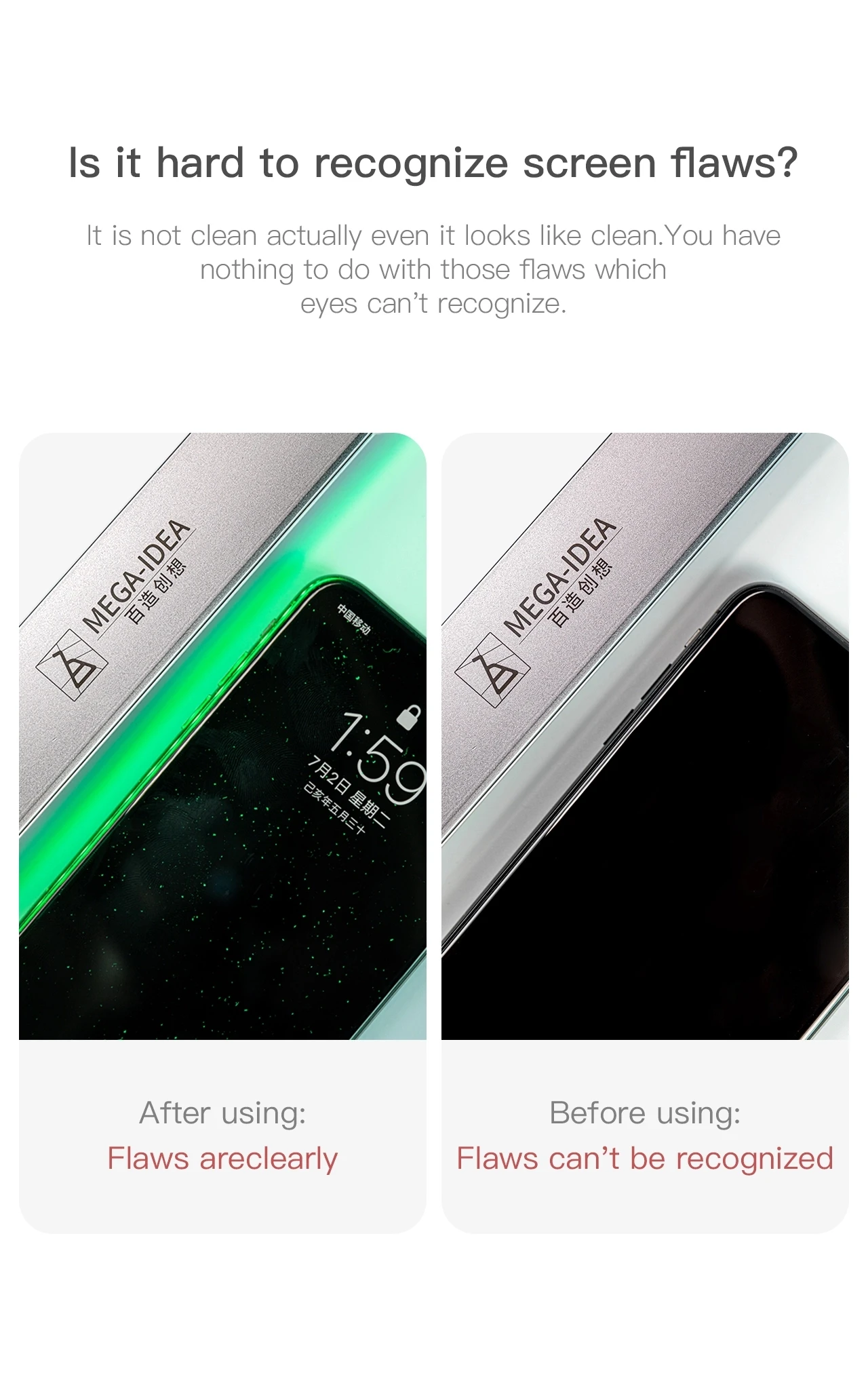 1. Немедленно обнаружите любые частицы пыли, прежде чем применить новый дигитайзер к iPads2. Обнаружите любые нормально невидимые трещины на ЖК-дисплее, которые вы собираетесь поместить на смартфон3. Работать быстрее, очищая ЖК один раз вместо очистки снова и снова.4. Пятна несовершенства и пыли мгновенно