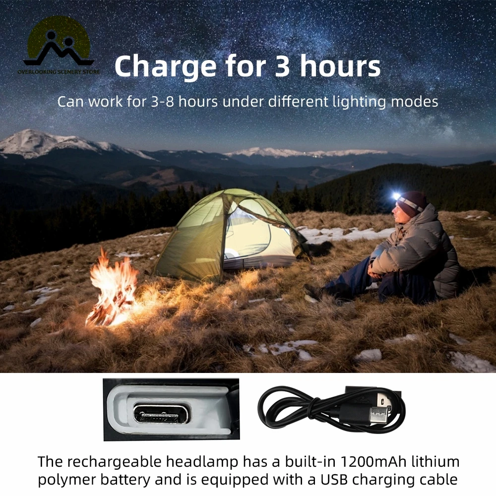 Пункт продажи один: [функция зарядки USB]: перезаряжаемый налобный фонарь имеет встроенный литий-полимерный аккумулятор 1200 мАч (перезаряжаемый) и оснащен usb-кабелем для зарядки, который может обеспечить вам более быструю зарядку. После зарядки в течение 3 часов, он может работать в течение 3-8 часов при различных режимах освещения.
