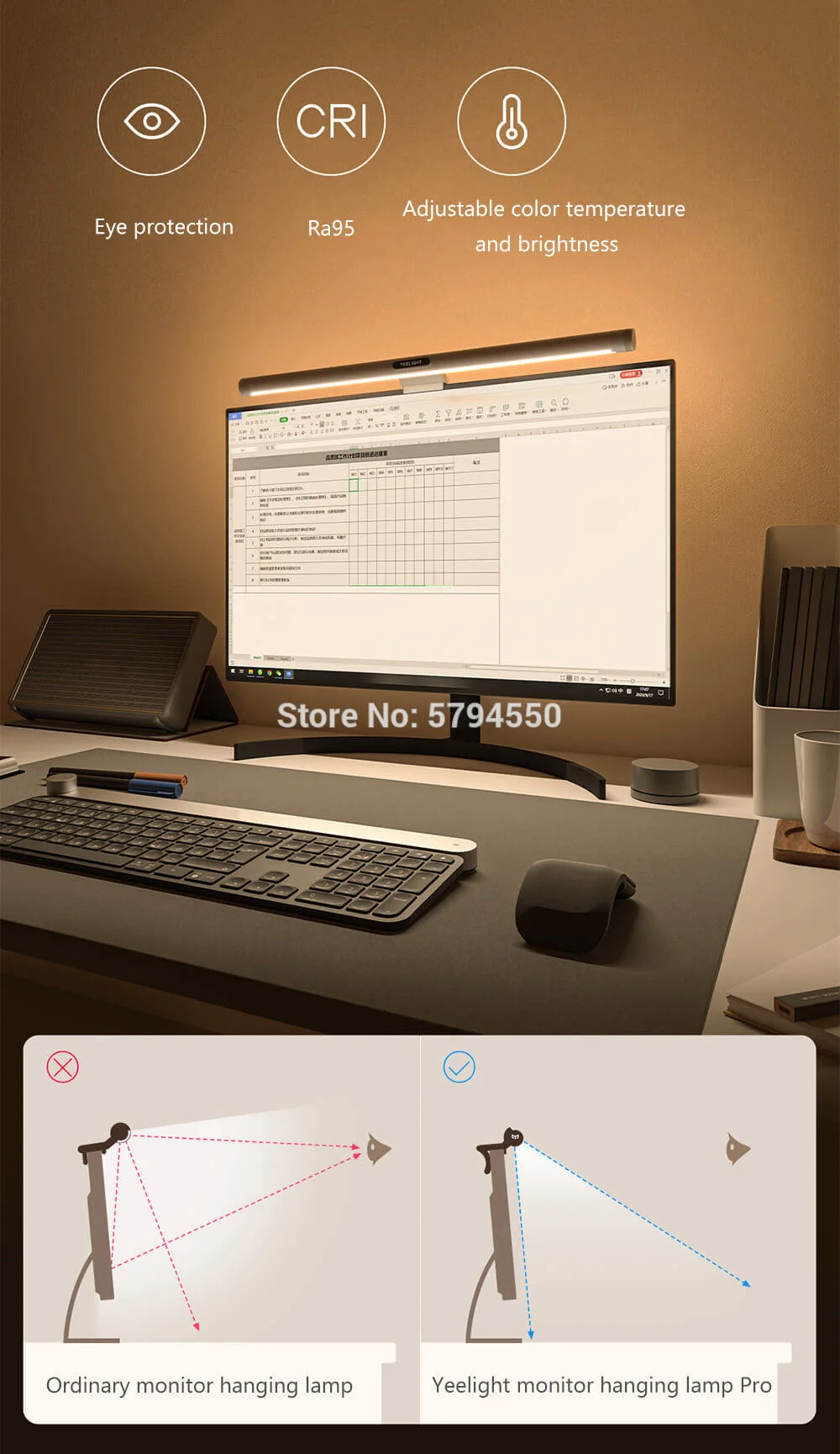 Ассиметричный передний светильник, проекционный дизайн и тонкий светильник, Выходная крышка эффективно уменьшают отражения экрана. Тройная защита глаз, глаза более удобные, хороший светильник. Удобное освещение для уменьшения усталости глаз.