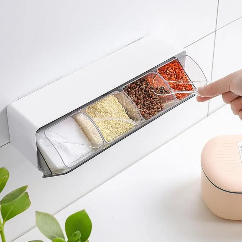 Полка для специй, 4 ячейки, кухонная ложка с крышкой, контейнер для приправ, Настенная коробка для специй и трав, быстрое приготовление