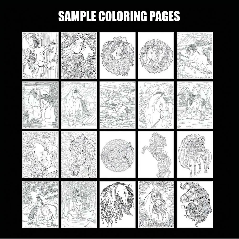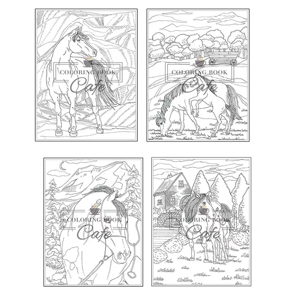 Раскраска с потрясающими лошадьми: дикие лошади, красивые деревенские сцены и успокаивающие горные земли, 25 страниц