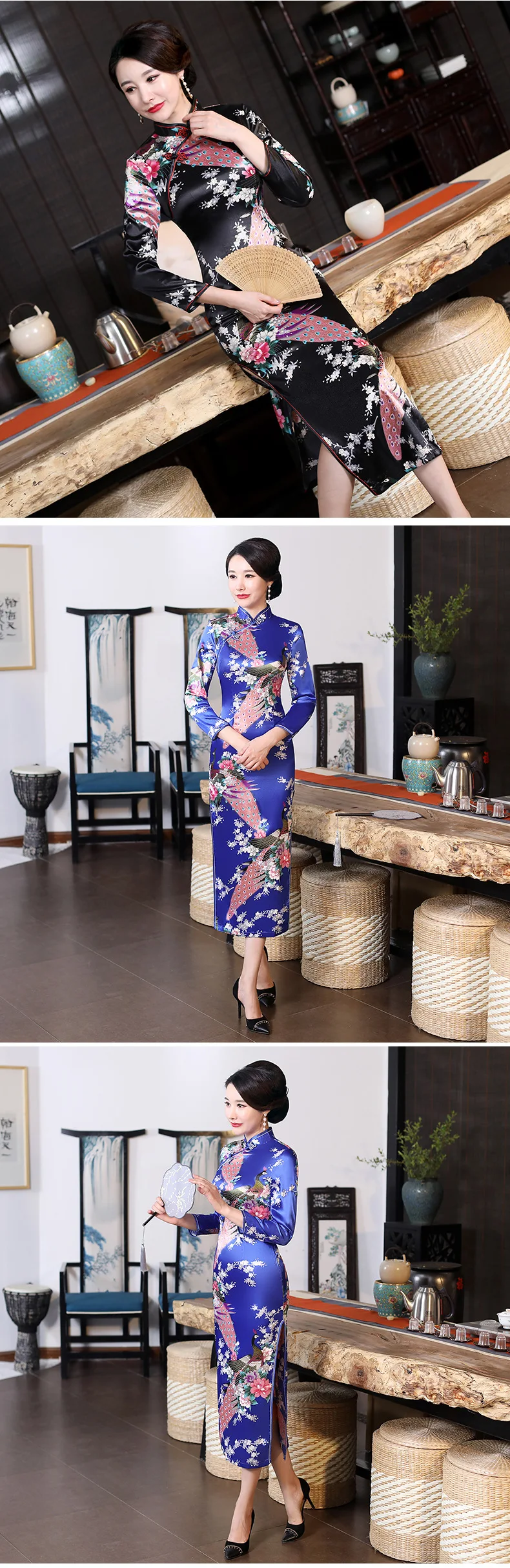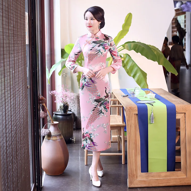 Женское атласное облегающее платье-Ципао, элегантное восточное платье в стиле Ципао с воротником-стойкой и винтажным принтом, классическое китайское платье на пуговицах размера плюс 6XL