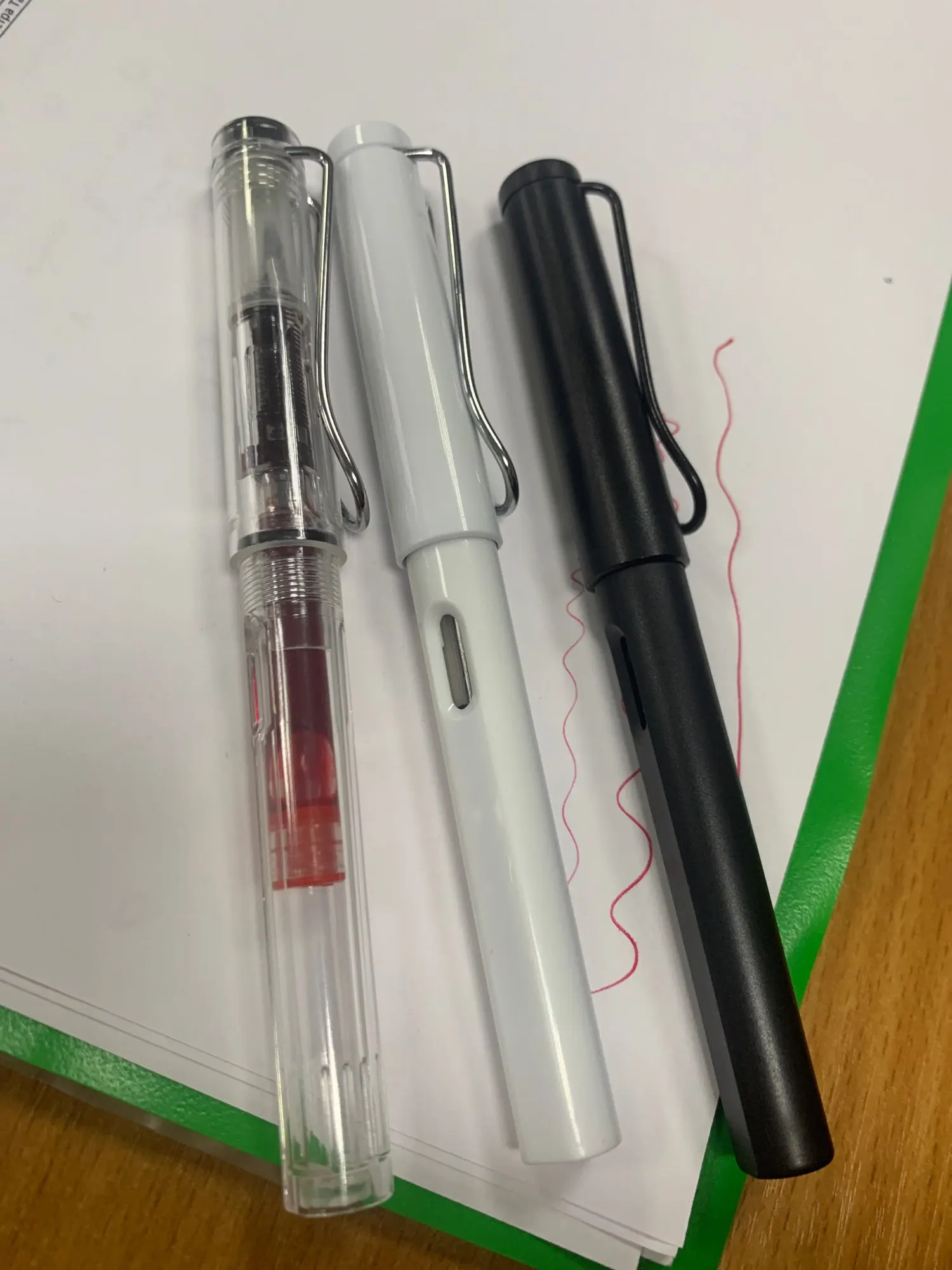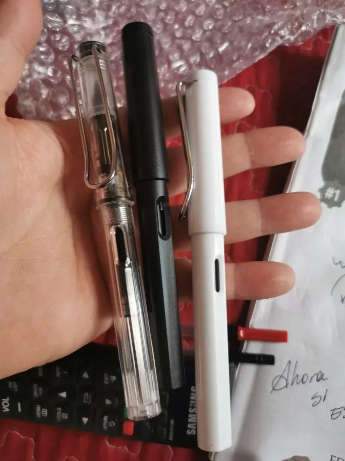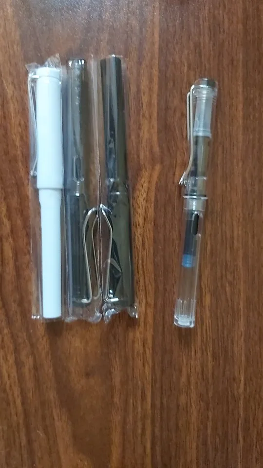 Отличные ручки, копия лами. У каждой есть адаптер для заправки, у прозрачной как на фото у двух других - шприцеподобные. Перо само по себе не EF писал ручками лами у них это будет самое толстое. Комплектация как на фотке. Пишут здорово.
