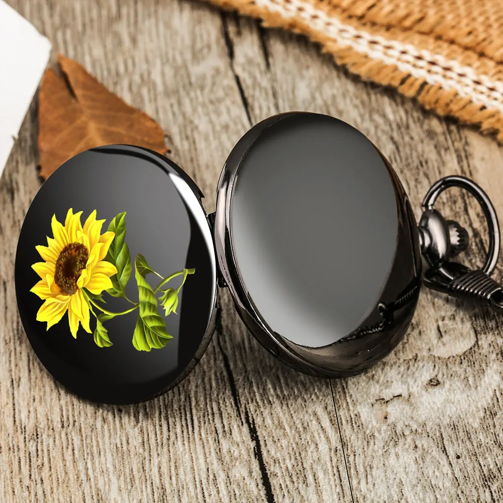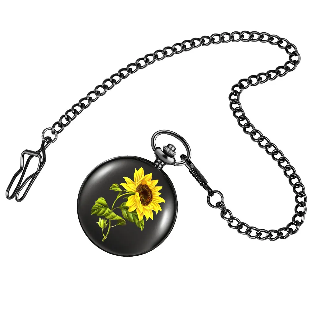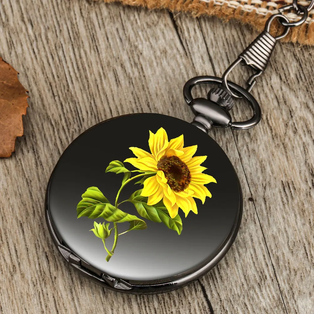 Модные художественные подсолнухи черный корпус кварцевые карманные часы кулон ожерелье 30 см цепочка сплав часы подарок для женщин мужчин