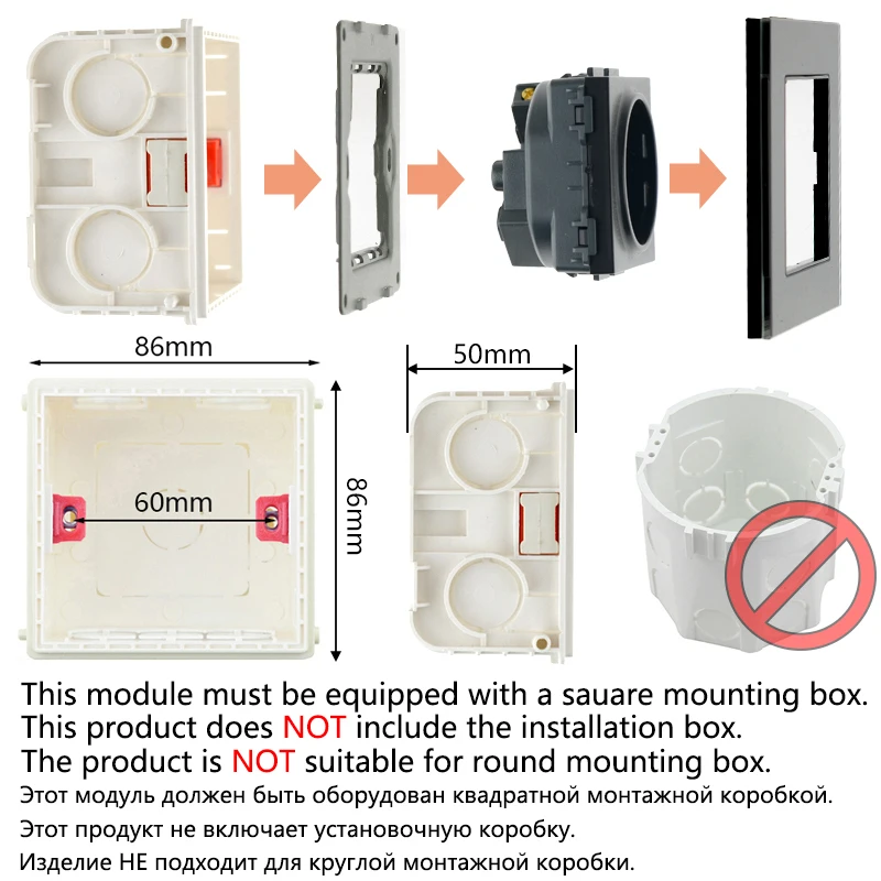 В: что входит в комплект поставки?A: один модуль.Вопрос: Может ли эта розетка быть установлена в круговой установочной коробке?О: нет.Вопрос: Что делать, если я не получил посылка?О: пожалуйста, свяжитесь с продавцом, продавец решит эту проблему для вас.