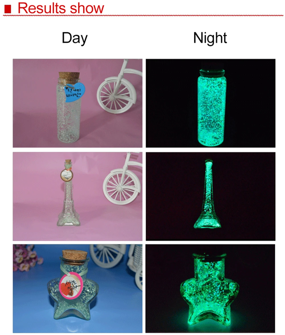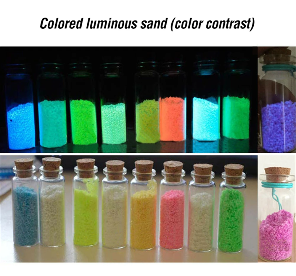 Светящийся песок может быть непосредственно помещен в прозрачную бутылку для украшения, или его можно наносить с помощью AB клея, чтобы зафиксировать песок на поверхности для достижения декоративного эффекта. Он также может быть использован для граффити, художественного творчества, творчества, подарков, ночных предупреждений и т. д. Популярная бутылка звездного неба, бутылка желаний и бутылка океана также добавляются с элементом светящегося песка. Продукт безопасен и безопасен для окружающей среды и может быть использован с уверенностью.