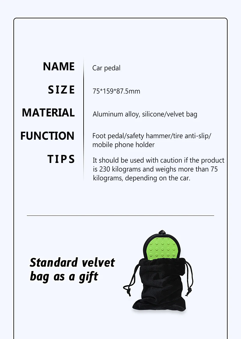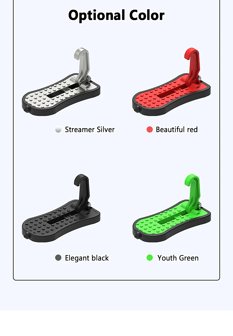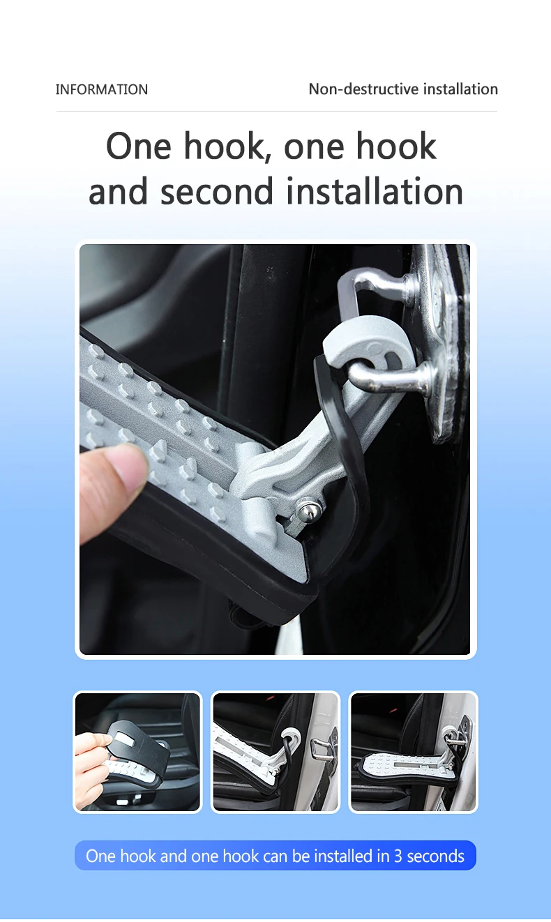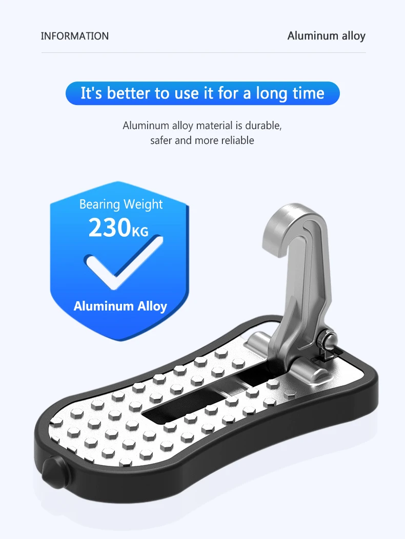 Универсальный складной Автомобильный багажник на крышу, подножка для двери автомобиля, универсальный защелкивающийся крючок, вспомогательная ножная педаль, безопасный молоток из алюминиевого сплаваОсобенности:1. Безопасный шаг двери для вашего автомобиля: благодаря конструкции из нескольких мягких резиновых буферных защитных прокладок, не беспокойтесь о повреждении краски в месте крепления и не вызовет зазубрин дверной рамки.2. Высококачественная подножка двери для крыши автомобиля: литая под давлением алюминиевая конструкция обеспечивает долговечность и долговечность. Крючок beefy имеет вес фунтов. Приподнятая поверхность делает его более прочным/не скользким даже во влажной обуви.3. Дает отличную высоту: облегчая доступ к крыше автомобиля, это огромный плюс для установки поперечных рельсов и автомобильных стеллажей, погрузки или разгрузки вашего корабля, Каяка, лыж, велосипеда, кемпинга, доска для серфинга. Это даже уменьшает беспорядок в вашем автомобиле от слежения в снегу.4. Универсальный шаг для автомобиля: конструкция подшипника с регулируемым углом делает дверь ступенькой горизонтальной как в прямом, так и в изогнутом засоре двери. Он универсален и подходит для всех автомобилей, внедорожников, джипов, Subaru, wrangler, cherokee, chevy, toyota, как передней, так и задней дверей.5. Многофункциональная и компактная складная лестница: благодаря складной портативной конструкции дверь автомобиля можно хранить в любом месте вашего автомобиля. Его также можно использовать в качестве молотка безопасности и колеса анти-Нескользящие устройство в случае аварии.Спецификация:Название: автомобильная универсальная многофункциональная педальМатериал: алюминиевый сплав + силиконПрименимые модели: УниверсальныеРазмер одной посылка: около 17,5*8,8*3,8 см/6,89*3,46*1,50 дюймаВес: около 340 г/шт.Цвет: серебристый, черныйУпаковочный лист:1 х универсальная подножка двери автомобиля