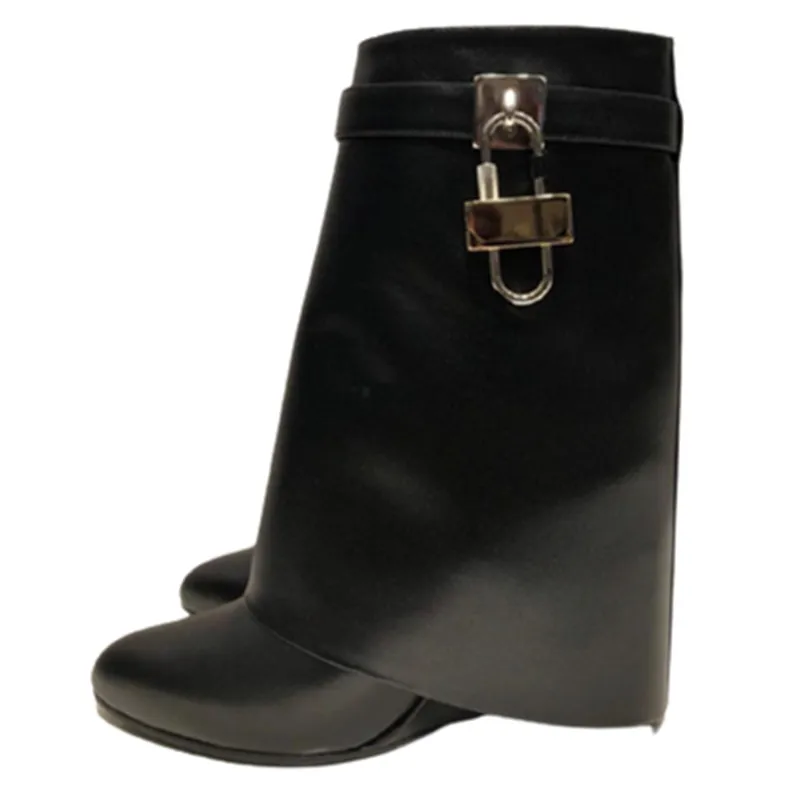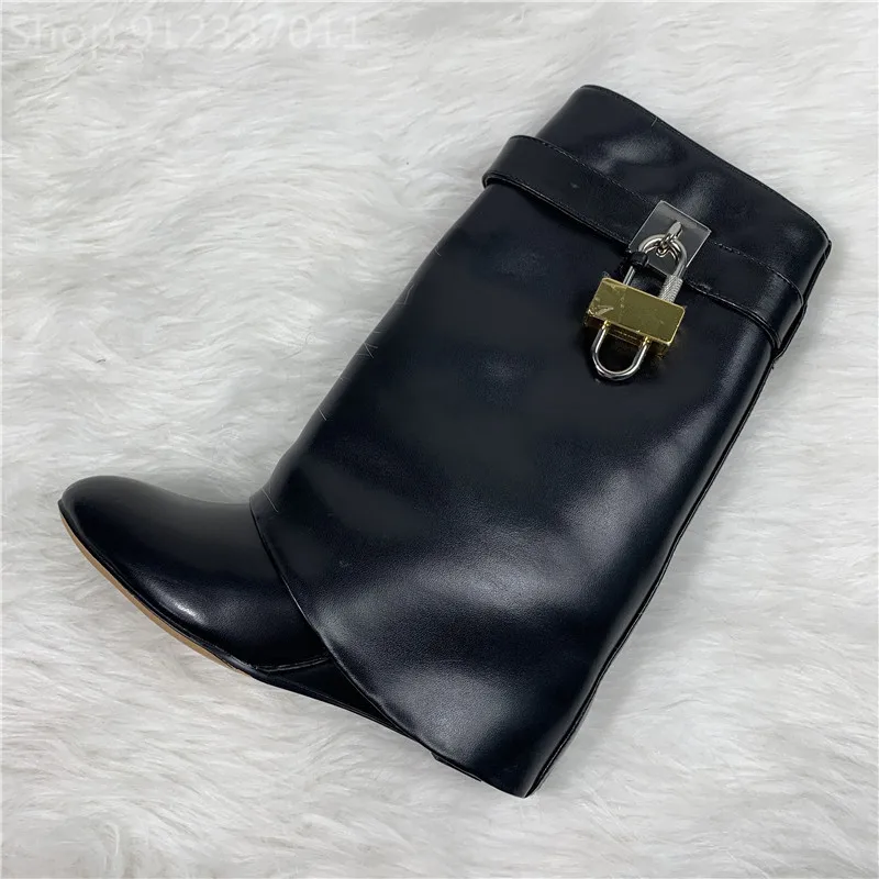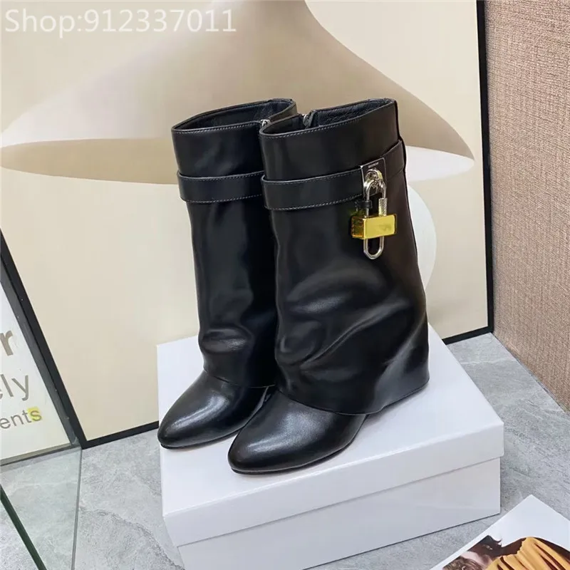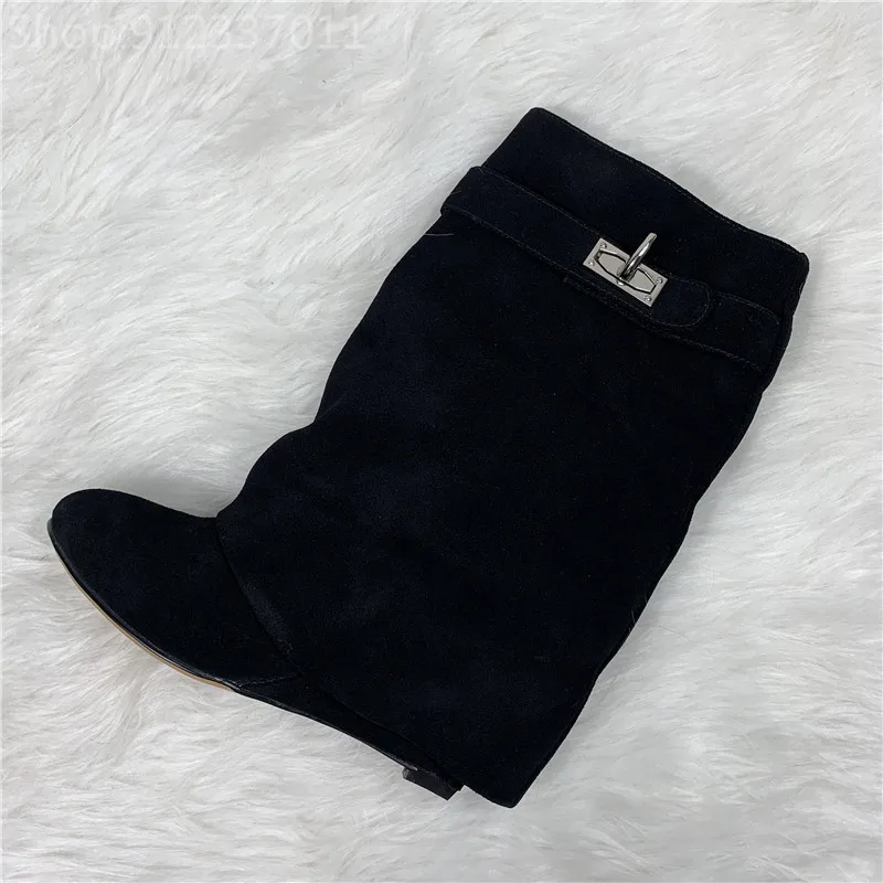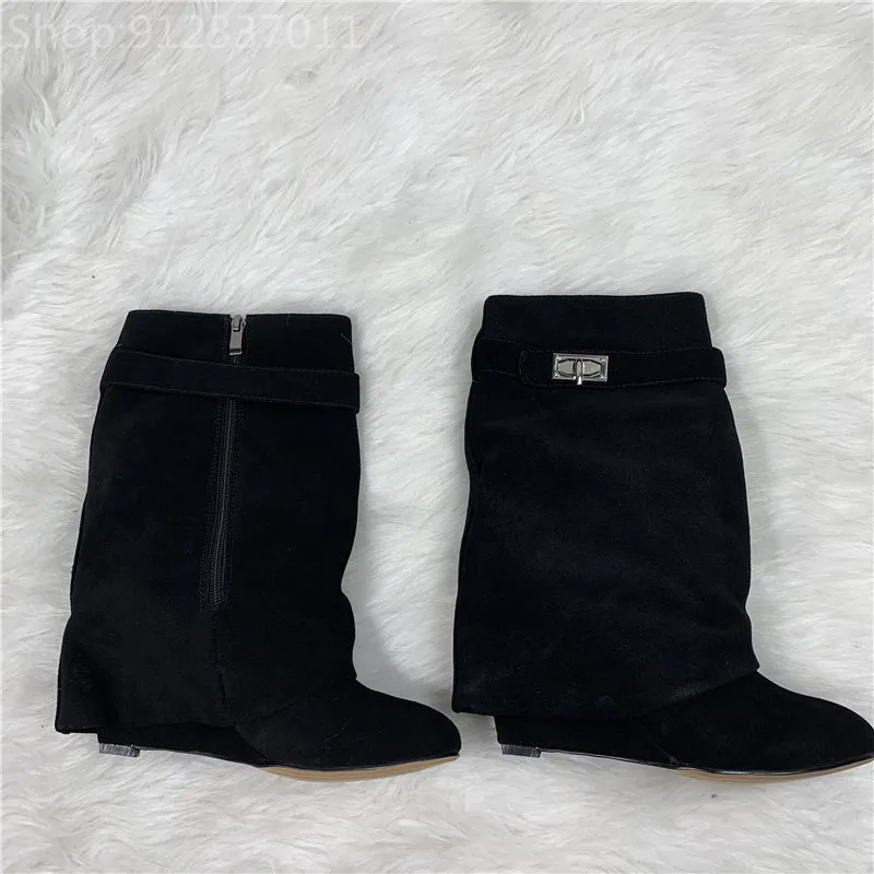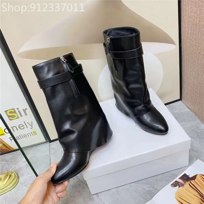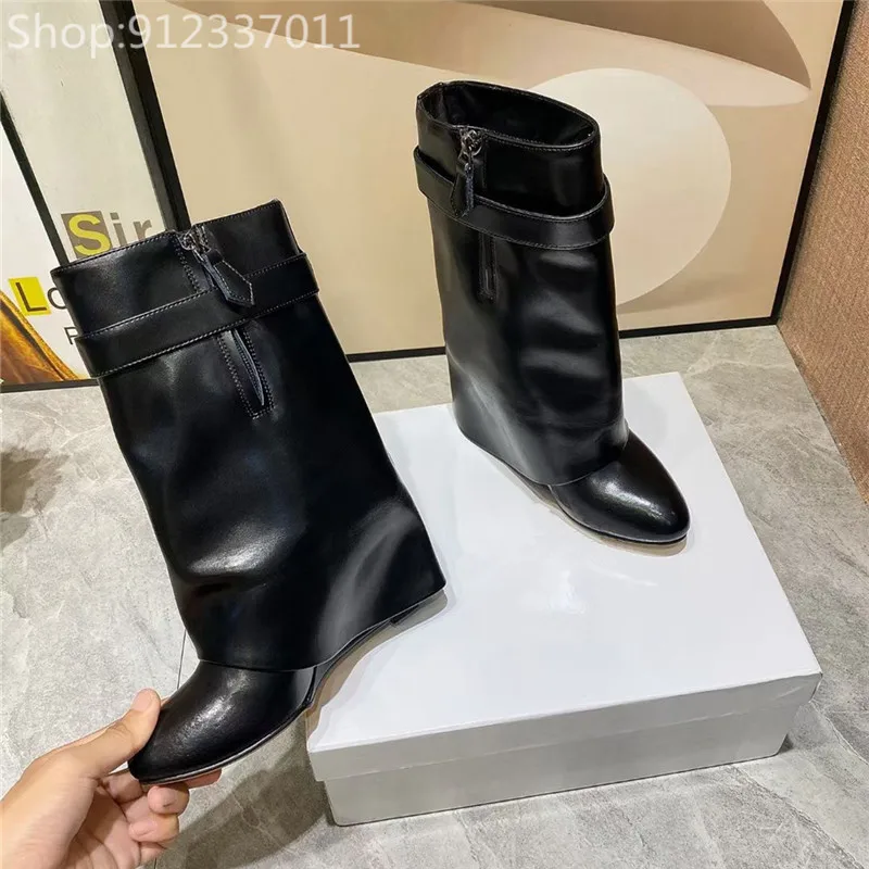 Женские сапоги на танкетке с замком Акула, черные складные сапоги д...