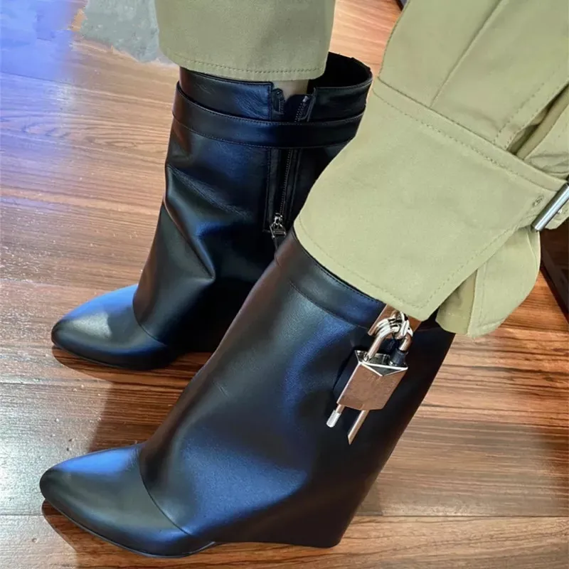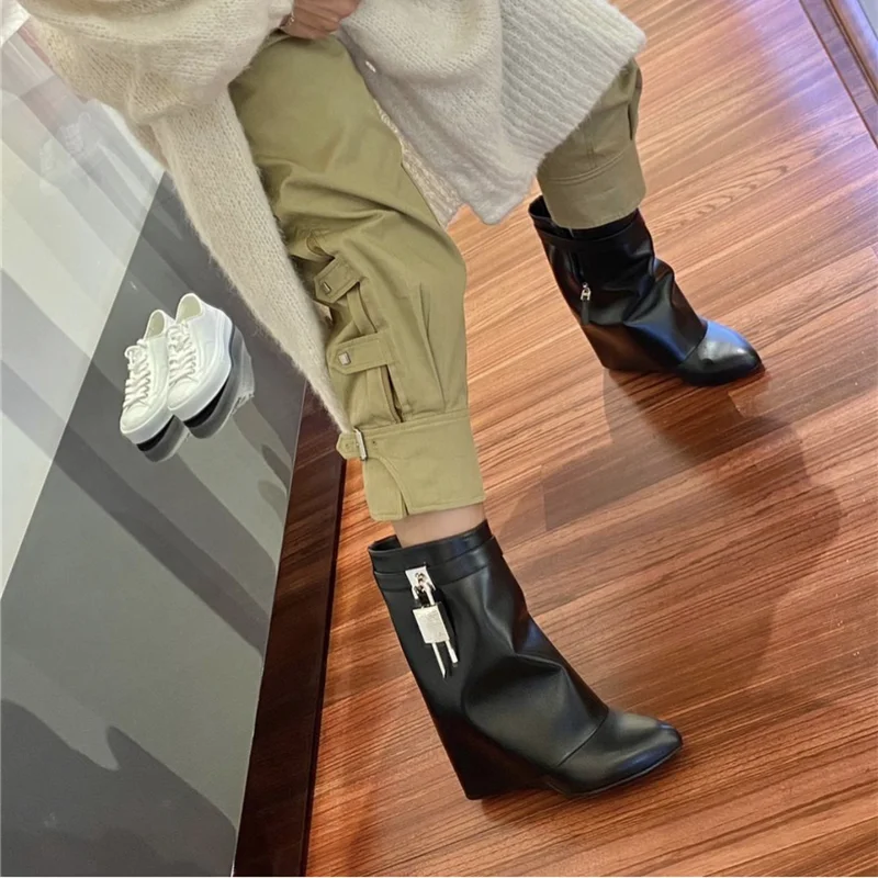 Металлический "Shark lock", женские ботинки на танкетке из натураль...