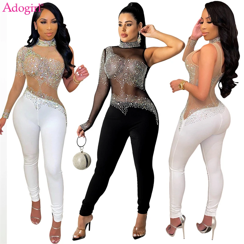 Комбинезон женский сетчатый со стразами, с длинным рукавом и ложным воротником