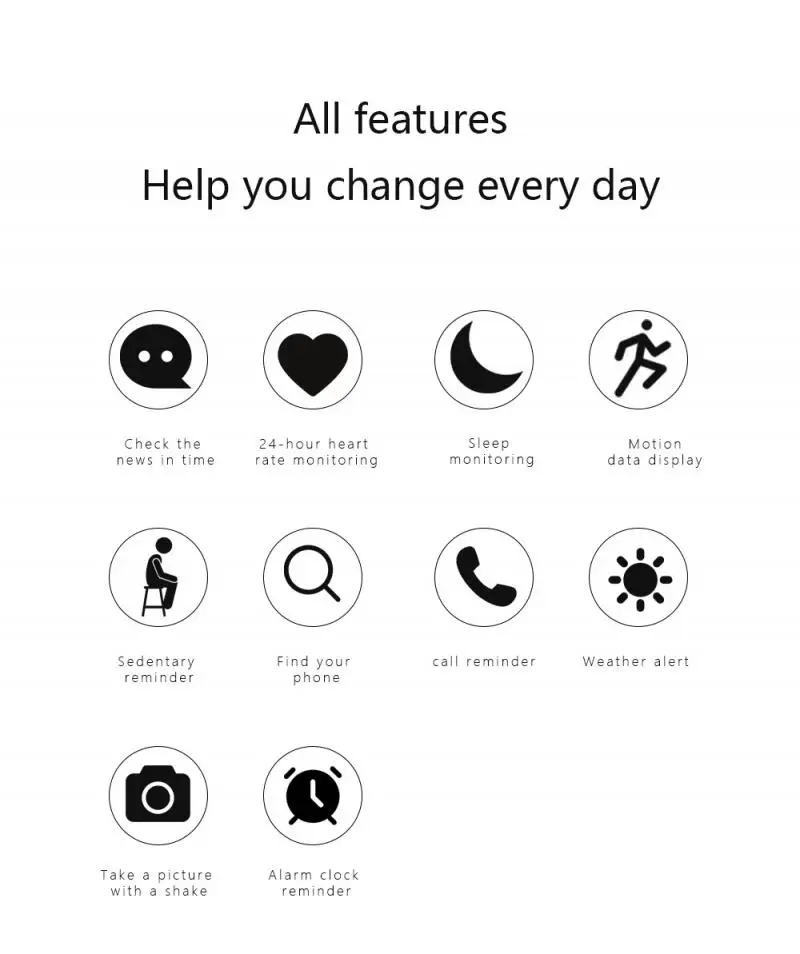 Основные функции: мониторинг сердечного ритма, подсчет шагов, сжигание калорий, расстояние, RTC дисплей, автоматический мониторинг сна, напоминание о звонках, push-сообщение, Будильник Напоминание, анти-потеря, удаленная камера, погода, многоязычный, пользовательский интерфейс, управление музыкой и т. д.