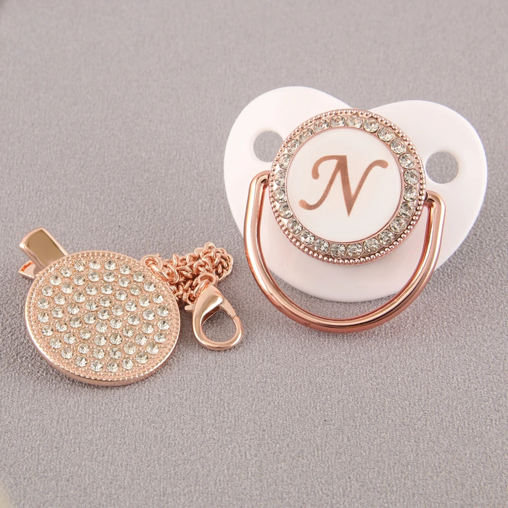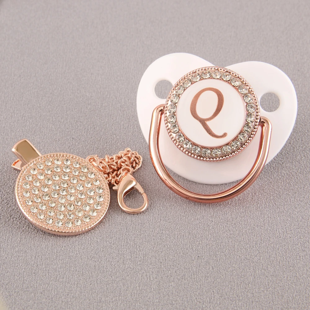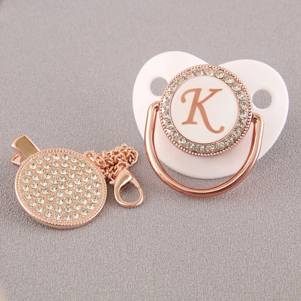 26 наименований, пустышка и клипсы для малышей с надписью, Силиконовая пустышка для младенцев, розовое золото, блестящая пустышка для новорожденных